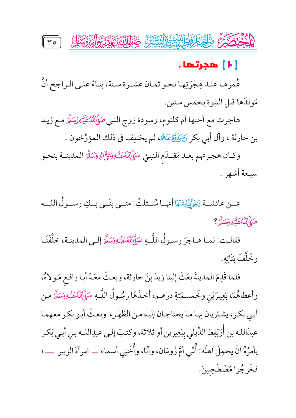 فقالت: لما هاجرَ رسولُ اللَّهِ - صلى الله عليه وسلم - إلى المدينة، خلَّفَنَا وخَلَّفَ بَنَاتِهِ.