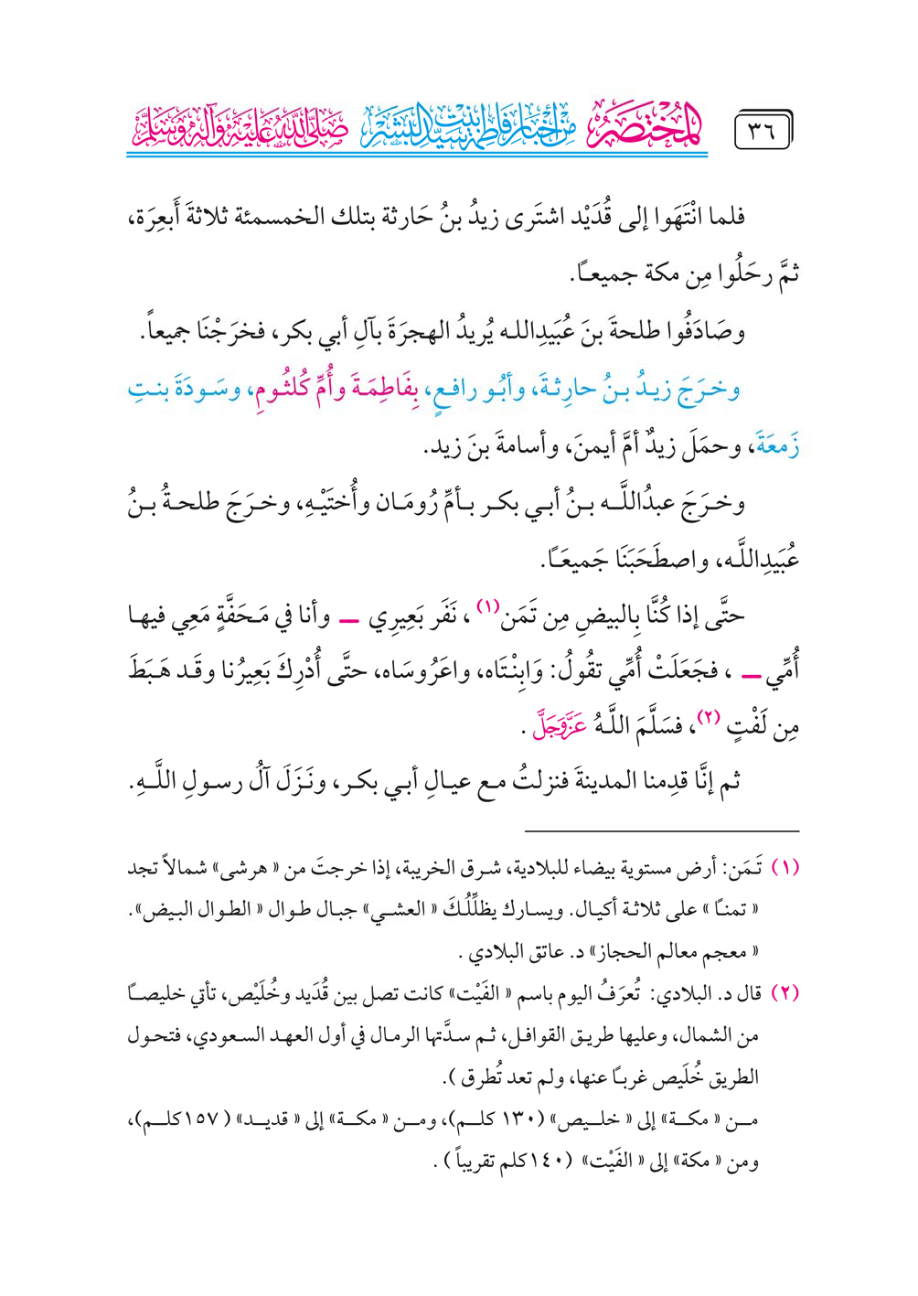 وخرَجَ عبدُاللَّه بنُ أبي بكر بأمِّ رُومَان وأُختَيْهِ، وخرَجَ طلحةُ بنُ عُبَيدِاللَّه، واصطَحَبَنَا جَميعَاً.