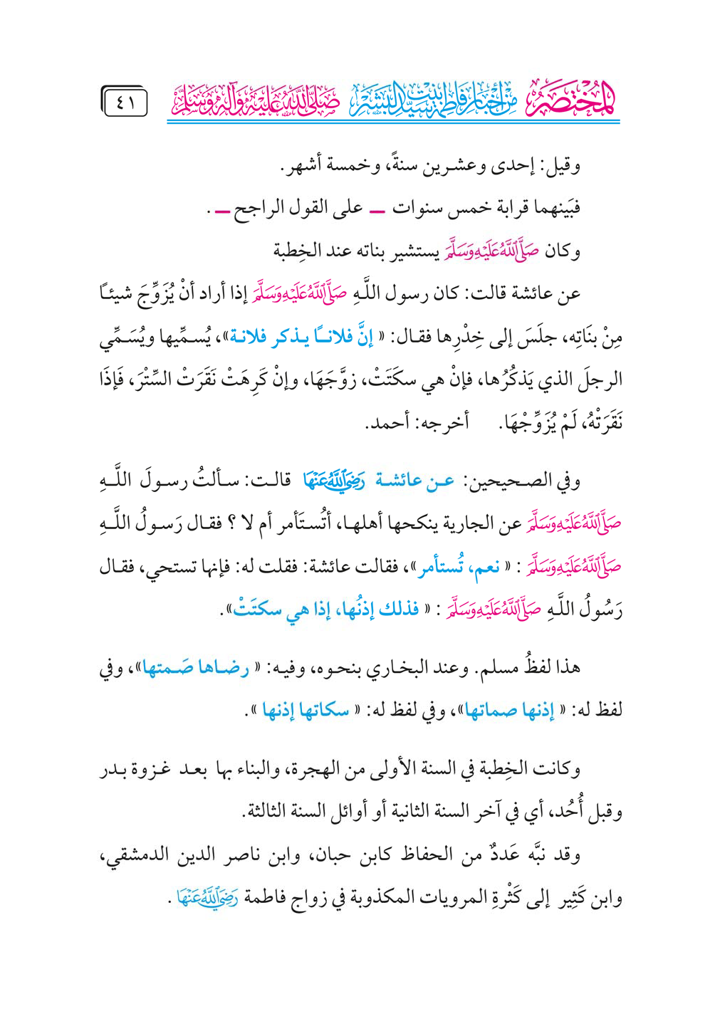 عن عائشة قالت: كان رسول اللَّهِ - صلى الله عليه وسلم - إذا أراد أنْ يُزَوِّجَ شيئاً مِنْ بنَاتِه، جلَسَ إلى خِدْرِها فقال: «إنَّ فلاناً يذكر فلانة»، يُسمِّيها ويُسَمِّي الرجلَ الذي يَذكُرُها، فإنْ هي سكَتَتْ، زوَّجَهَا، وإنْ كَرِهَتْ نَقَرَتْ السِّتْرَ، فَإذَا نَقَرَتْهُ، لَمْ يُزَوِّجْهَا. أخرجه: أحمد.