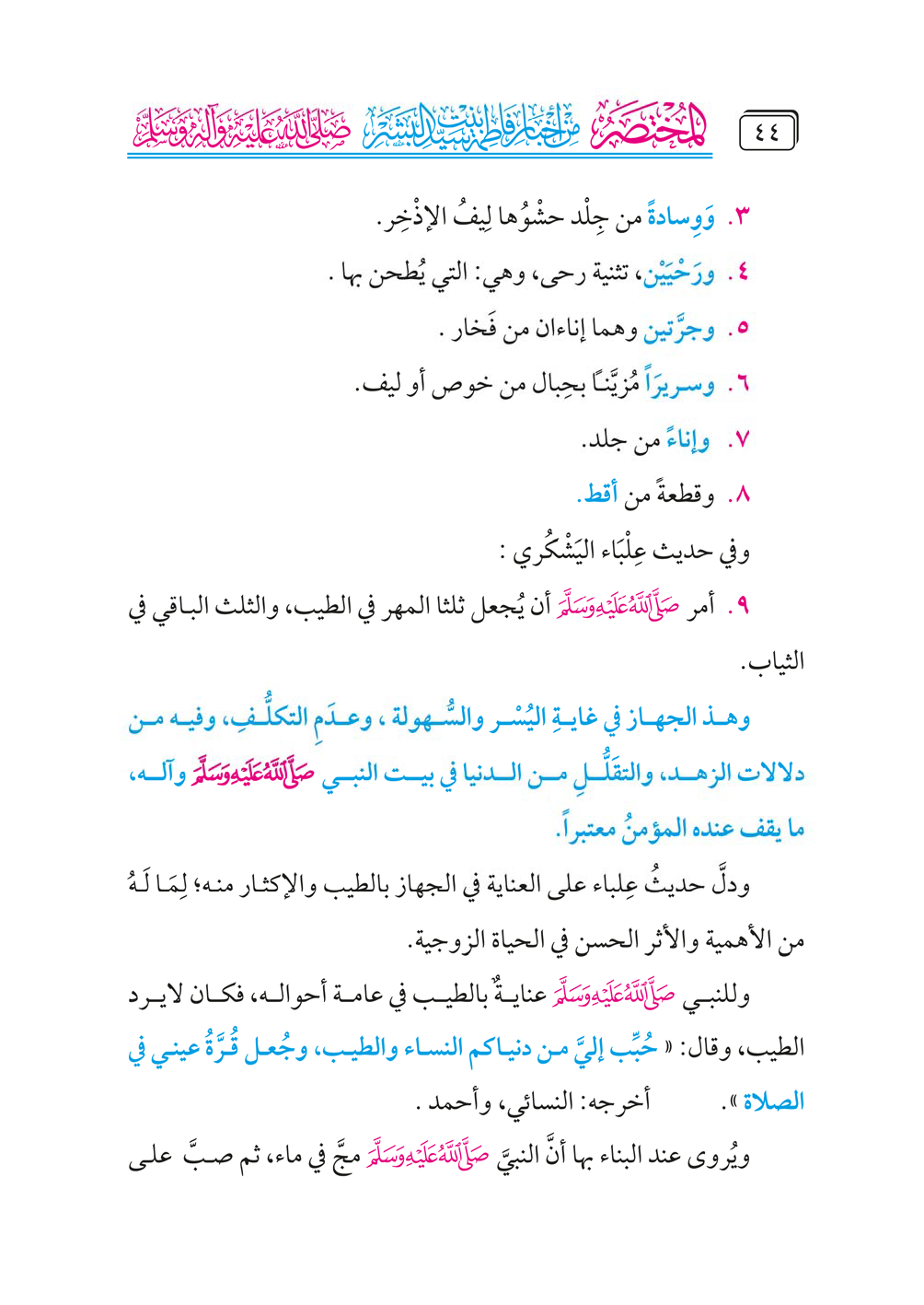 ٩. أمر - صلى الله عليه وسلم - أن يُجعل ثلثا المهر في الطيب، والثلث الباقي في الثياب.