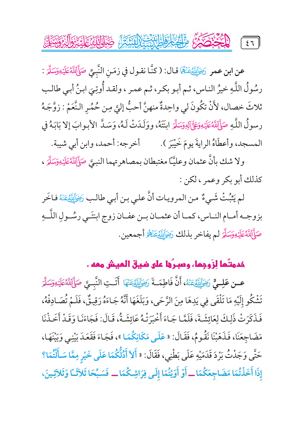 عن ابن عمر - رضي الله عنهما - قال: (كنَّا نقول في زمَنِ النَّبِيِّ - صلى الله عليه وسلم -: رسُولُ اللَّهِ خيرُ الناس، ثم أبو بكر، ثم عمر، ولقد أُوتِيَ ابنُ أبي طالب ثلاثَ خصال، لأَنْ تكُونَ لي واحِدةٌ منهنَّ أحبُّ إليَّ مِن حُمُرِ النَّعَمْ: زوَّجَهُ رسولُ اللَّهِ - صلى الله عليه وعلى آله وسلم - ابنَتَهُ، ووَلَدَتْ لَهُ، وَسَدَّ الأبوابَ إلا بَابَهُ في المسجد، وأعطَاهُ الرايةَ يومَ خَيْبَرَ). أخرجه: أحمد، وابن أبي شيبة.