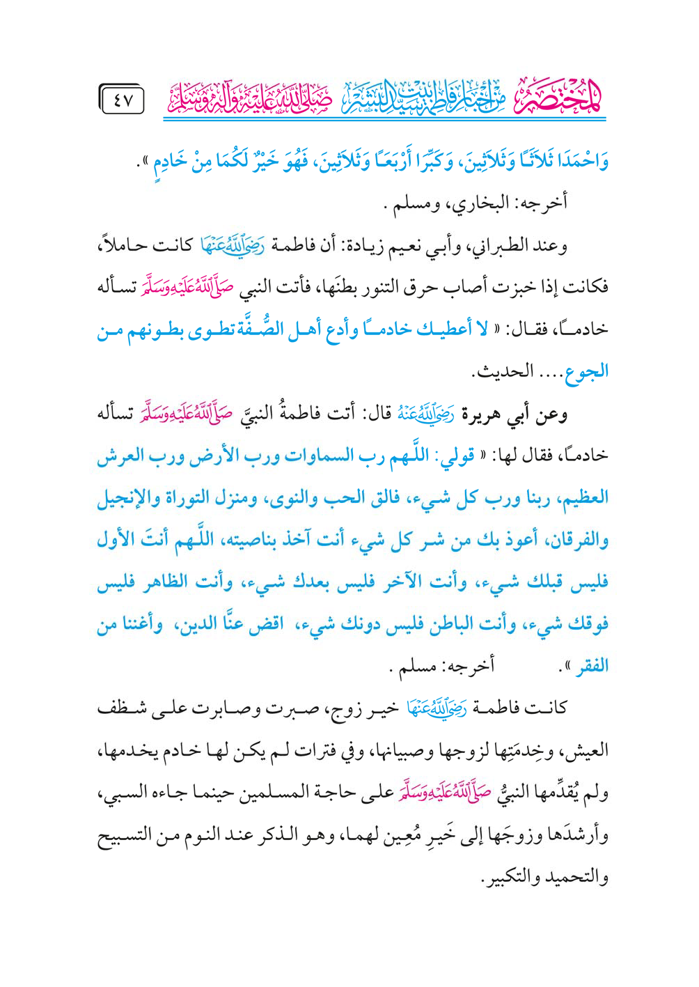 وعند الطبراني، وأبي نعيم زيادة: أن فاطمة - رضي الله عنها - كانت حاملاً، فكانت إذا خبزت أصاب حرق التنور بطنَها، فأتت النبي - صلى الله عليه وسلم - تسأله خادماً، فقال: «لا أعطيك خادماً وأدع أهل الصُّفَّة تطوى بطونهم من الجوع. الحديث.