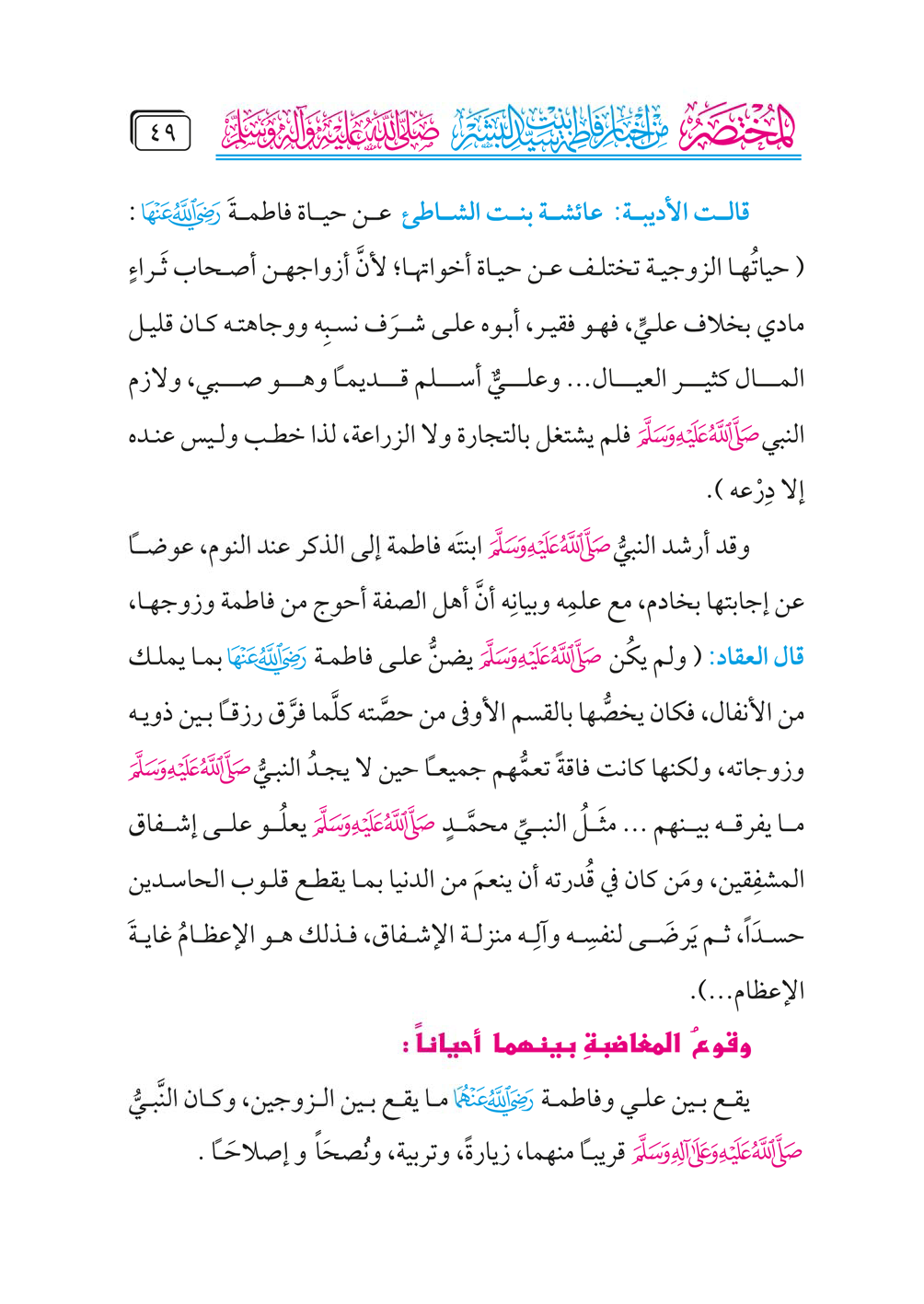 وقد أرشد النبيُّ - صلى الله عليه وسلم - ابنتَه فاطمة إلى الذكر عند النوم، عوضاً عن إجابتها بخادم، مع علمِه وبيانِه أنَّ أهل الصفة أحوج من فاطمة وزوجها، قال العقاد: (ولم يكُن - صلى الله عليه وسلم - يضنُّ على فاطمة - رضي الله عنها - بما يملك من الأنفال، فكان يخصُّها بالقسم الأوفى من حصَّته كلَّما فرَّق رزقاً بين ذويه وزوجاته، ولكنها كانت فاقةً تعمُّهم جميعاً حين لا يجدُ النبيُّ - صلى الله عليه وسلم - ما يفرقه بينهم مثَلُ النبيِّ محمَّدٍ - صلى الله عليه وسلم - يعلُو على إشفاق المشفِقين، ومَن كان في قُدرته أن ينعمَ من الدنيا بما يقطع قلوب الحاسدين حسدَاً، ثم يَرضَى لنفسِه وآلِه منزلة الإشفاق، فذلك هو الإعظامُ غايةَ الإعظام).