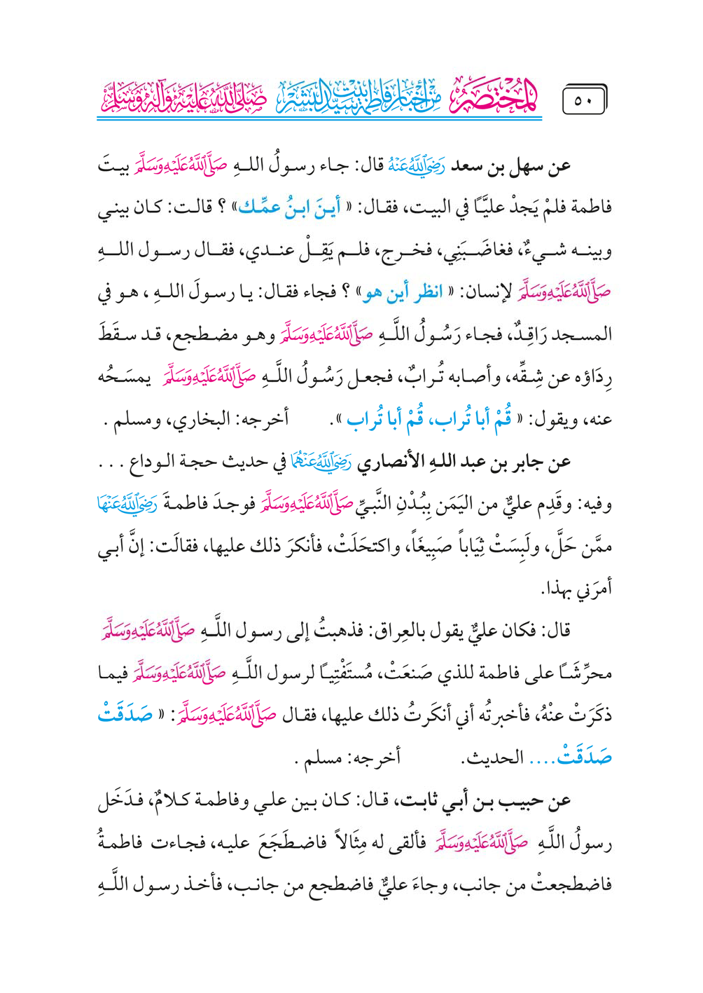 عن سهل بن سعد - رضي الله عنه - قال: جاء رسولُ اللهِ - صلى الله عليه وسلم - بيتَ فاطمة فلمْ يَجدْ عليَّاً في البيت، فقال: «أينَ ابنُ عمِّك»؟ قالت: كان بيني وبينه شيءٌ، فغاضَبَنِي، فخرج، فلم يَقِلْ عندي، فقال رسول اللهِ - صلى الله عليه وسلم - لإنسان: «انظر أين هو»؟ فجاء فقال: يا رسولَ اللهِ، هو في المسجد رَاقِدٌ، فجاء رَسُولُ اللَّهِ - صلى الله عليه وسلم - وهو مضطجع، قد سقَطَ رِدَاؤه عن شِقِّه، وأصابه تُرابٌ، فجعل رَسُولُ اللَّهِ - صلى الله عليه وسلم - يمسَحُه عنه، ويقول: «قُمْ أبا تُراب، قُمْ أبا تُراب». أخرجه: البخاري، ومسلم.
