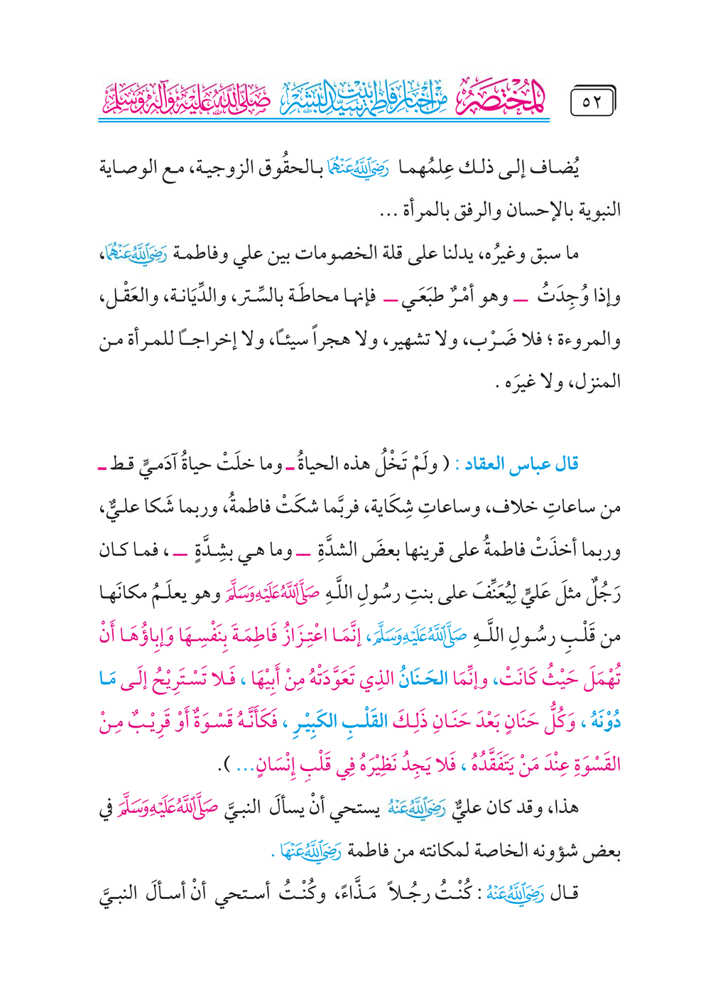 قال عباس العقاد: (ولَمْ تَخْلُ هذه الحياةُ ـ وما خلَتْ حياةُ آدَميٍّ قط ـ من ساعاتِ خلاف، وساعاتِ شِكَاية، فربَّما شكَتْ فاطمةُ، وربما شَكا عليٌّ، وربما أخذَتْ فاطمةُ على قرينها بعضَ الشدَّةِ ــ وما هي بشِدَّةٍ ــ، فما كان رَجُلٌ مثلَ عَليٍّ لِيُعَنِّفَ على بنتِ رسُولِ اللَّهِ - صلى الله عليه وسلم - وهو يعلَمُ مكانَها من قَلْبِ رسُولِ اللَّهِ - صلى الله عليه وسلم -، إنَّمَا اعْتِزَازُ فَاطِمَةَ بِنَفْسِهَا وَإبِاؤُهَا أَنْ تُهْمَلَ حَيْثُ كَانَتْ، وإنِّمَا الحَنَانُ الذِي تَعَوَّدَتْهُ مِنْ أَبِيْهَا، فَلا تَسْتَرِيْحُ إلَى مَا دُوْنَهُ، وَكُلُّ حَنَانٍ بَعْدَ حَنَانِ ذَلِكَ القَلْبِ الكَبِيْرِ، فَكَأَنَّهُ قَسْوَةٌ أَوْ قَرِيْبٌ مِنْ القَسْوَةِ عِنْدَ مَنْ يَتَفَقَّدُهُ، فَلا يَجِدُ نَظِيْرَهُ فِي قَلْبِ إِنْسَانٍ).