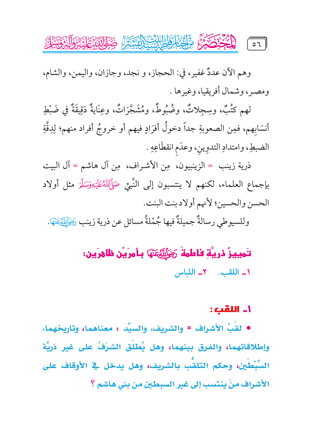 - لقَبُ الأشراف = والشريف، والسيِّد: معناهما، وتاريخهما، وإطلاقاتهما، والفرق بينهما، وهل يُطلَق الشرَفُ على غير ذريَّة السِّبْطَين، وحكم التلقُّب بالشريف، وهل يدخل في الأوقاف على الأشراف منَ ينتسب إلى غير السبطين من بني هاشم؟