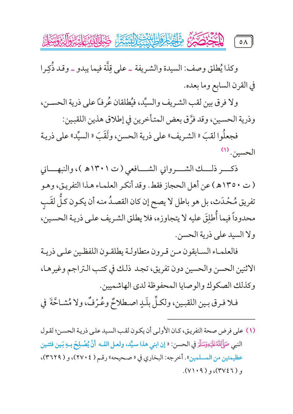 (¬١) على فرض صحة التفريق، كان الأولى أن يكون لقب السيد على ذرية الحسن؛ لقول النبي - صلى الله عليه وسلم - في الحسن: «إن ابني هذا سيِّد، ولعل الله أنْ يُصْلِحَ بهِ بَين فئتين عظيمتين من المسلمين». أخرجه: البخاري في «صحيحه» رقم (٢٧٠٤)، و (٣٦٢٩)، و (٣٧٤٦)، و (٧١٠٩).