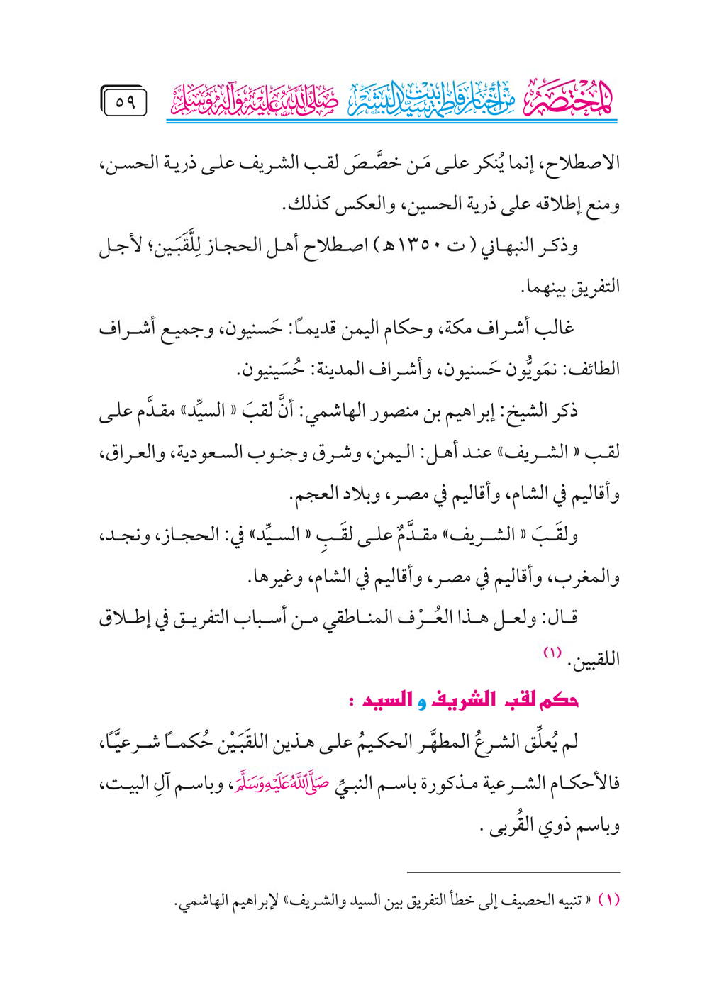 (¬١) «تنبيه الحصيف إلى خطأ التفريق بين السيد والشريف» لإبراهيم الهاشمي.