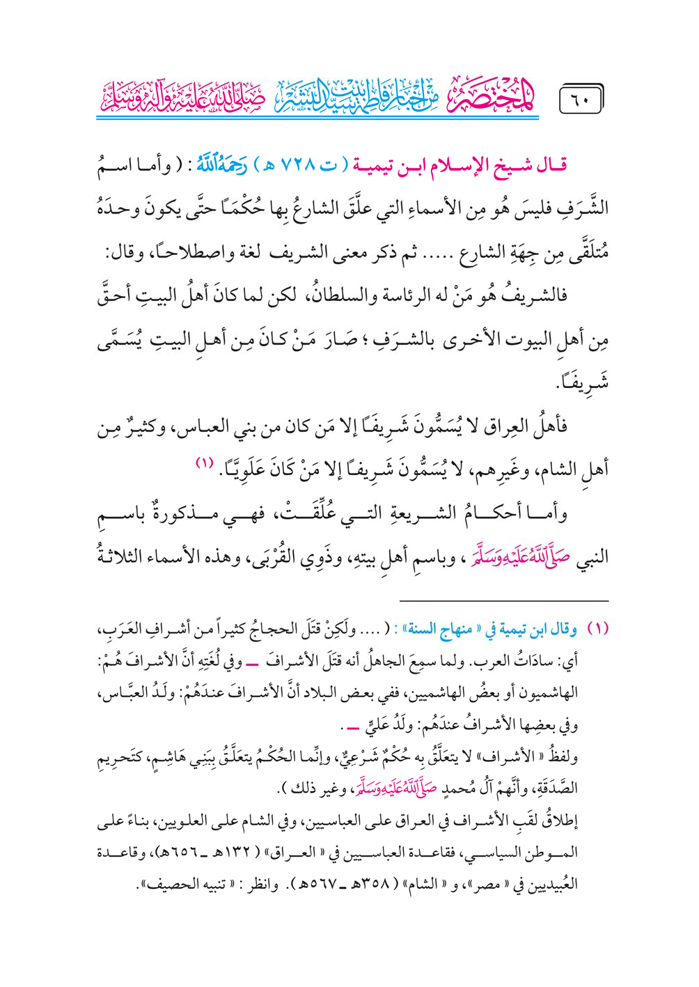 فأهلُ العِراق لا يُسَمُّونَ شَرِيفَاً إلا مَن كان من بني العباس، وكثيرٌ مِن أهلِ الشام، وغَيرِهم، لا يُسَمُّونَ شَرِيفاً إلا مَنْ كَانَ عَلَوِيَّاً. (¬١)