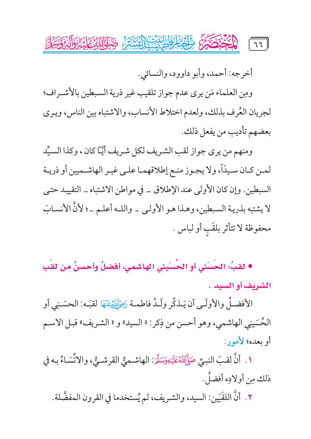 الأفضلُ والأولَى أن يَذكُر ولَدُ فاطمة - رضي الله عنها - لقبَه: الحسَنِي أو الحُسَينِي الهاشمي، وهو أحسن من ذِكر: «السيد» و «الشريف» قبل الاسم أو بعده؛ لأمور: