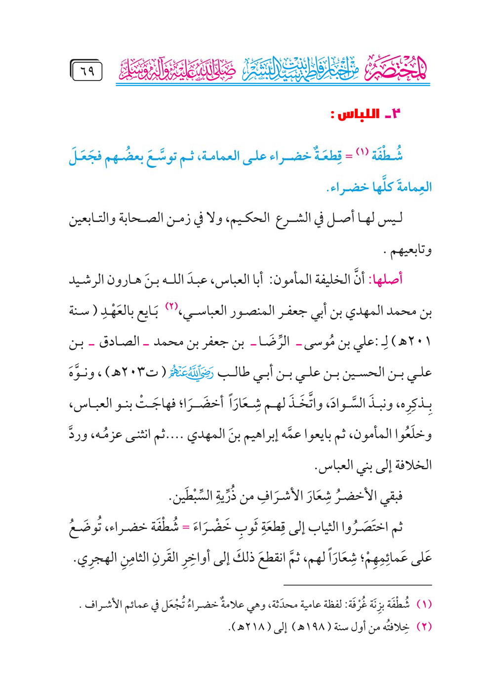 ثم اختَصَرُوا الثياب إلى قِطعَةِ ثَوبِ خَضْرَاءَ = شُطْفَة خضراء، تُوضَعُ عَلى عَمائِمِهِمْ؛ شِعَارَاً لهم، ثمَّ انقطعَ ذلكَ إلى أواخِرِ القَرنِ الثامِنِ الهجرِي.