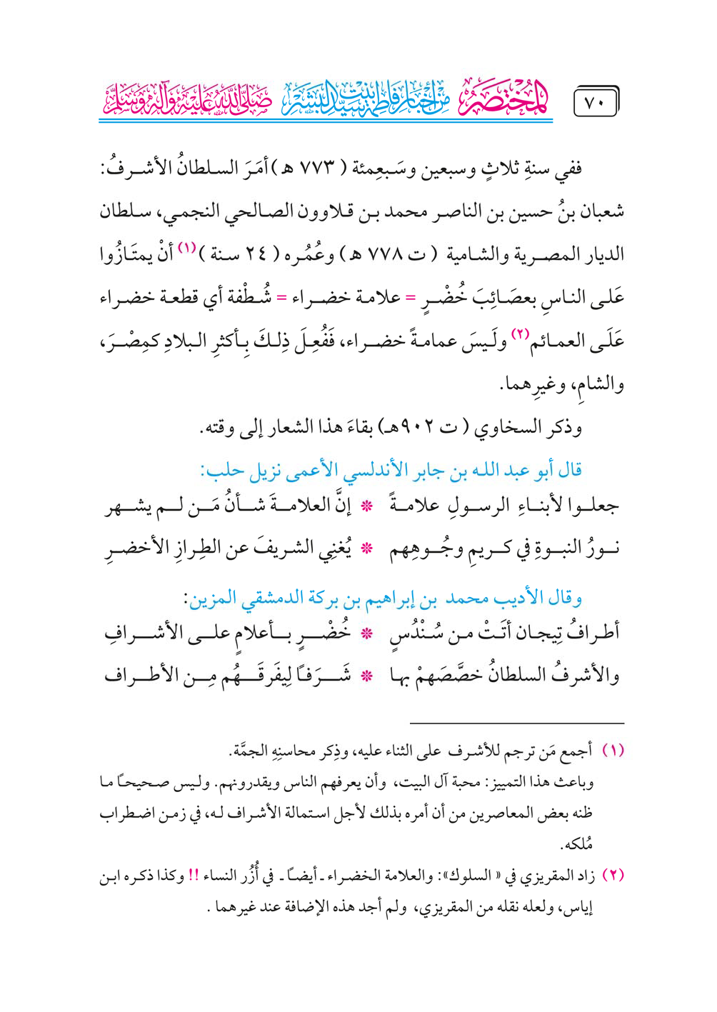 أنْ يمتَازُوا عَلى الناسِ بعصَائِبَ خُضْرٍ = علامة خضراء = شُطْفة أي قطعة خضراء عَلَى العمائم (¬٢) ولَيسَ عمامةً خضراء، فَفُعِلَ ذِلكَ بِأكثرِ البلادِ كمِصْرَ، والشامِ، وغيرِهما.