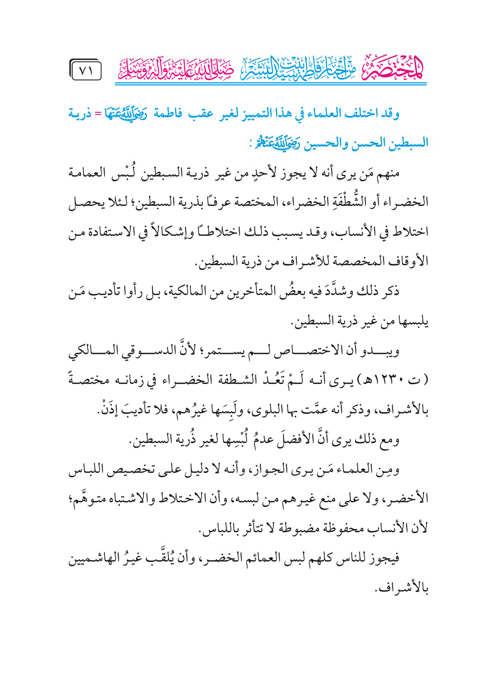 منهم مَن يرى أنه لا يجوز لأحدٍ من غير ذرية السبطين لُبْس العمامة الخضراء أو الشُّطْفَةِ الخضراء، المختصة عرفاً بذرية السبطين؛ لئلا يحصل اختلاط في الأنساب، وقد يسبب ذلك اختلاطاً وإشكالاً في الاستفادة من الأوقاف المخصصة للأشراف من ذرية السبطين.