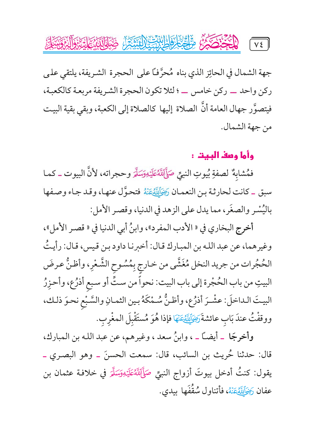 وأخرجَا ـ أيضاً ـ، وابنُ سعد، وغيرهم، عن عبد الله بن المبارك، قال: حدثنا حُريث بن السائب، قال: سمعت الحسنَ ـ وهو البصري ـ يقول: كنتُ أدخل بيوتَ أزواج النبيِّ - صلى الله عليه وسلم - في خلافة عثمان بن عفان - رضي الله عنه -، فأتناول سُقُفَها بيدي.