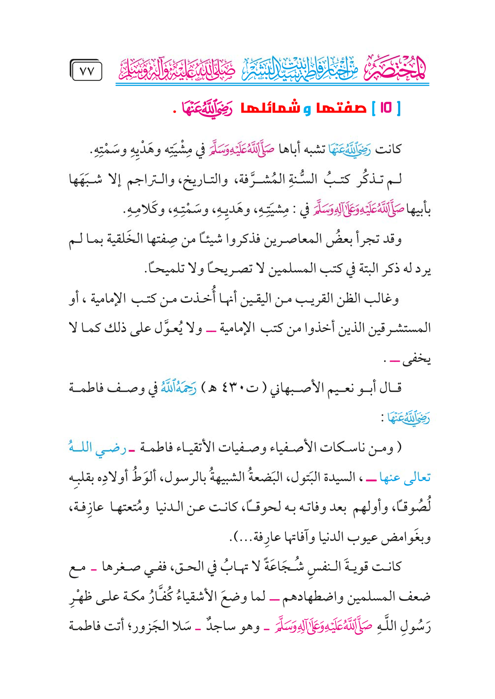 قال أبو نعيم الأصبهاني (ت ٤٣٠ هـ) - رحمه الله - في وصف فاطمة - رضي الله عنها -: