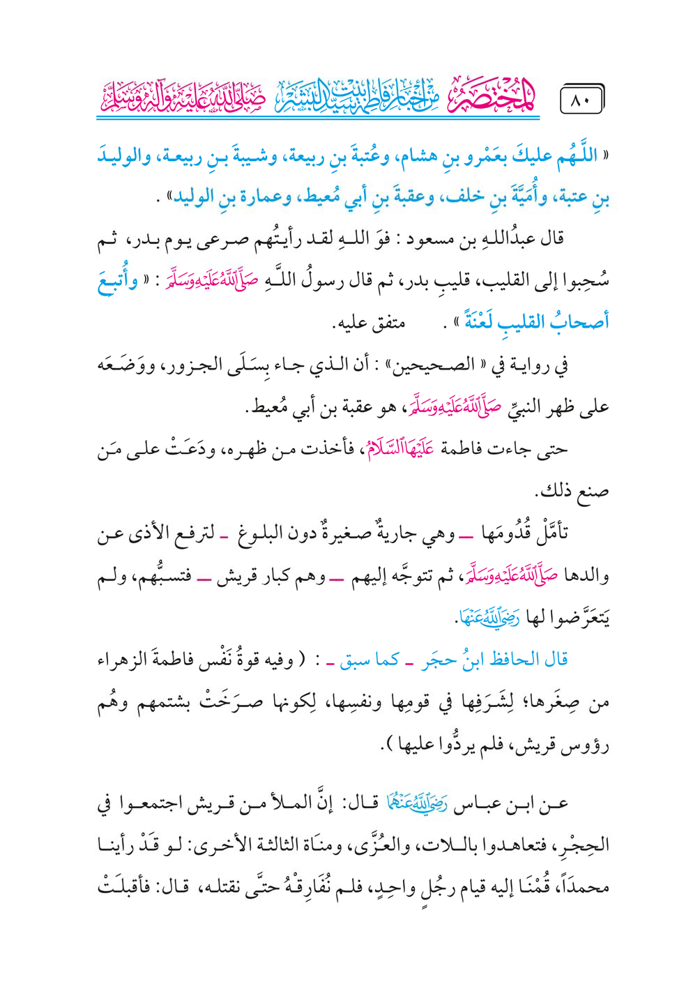 قال الحافظ ابنُ حجَر ـ كما سبق ـ: (وفيه قوةُ نَفْس فاطمةَ الزهراء من صِغَرها؛ لِشَرَفِها في قومِها ونفسِها، لِكونها صرَخَتْ بشتمهم وهُم رؤوس قريش، فلم يردُّوا عليها).
