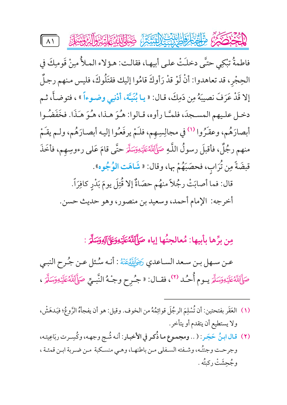 (¬٢) قال ابنُ حَجَر: ( .. ومجموع ما ذُكر في الأخبار: أنه شُج وجهه، وكُسِرت ربَاعِيته، وجرحت وجنتُه، وشفته السفلى من باطنها، وهي منسكبة من ضربة ابن قمئة، وجُحِشَتْ ركبتُه. = =
