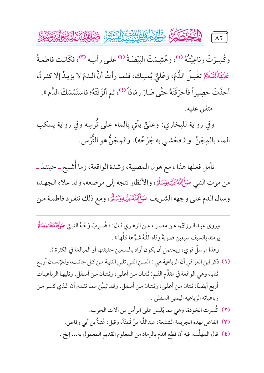 وكُسِرَتْ ربَاعِيَّتُهُ (¬١)، وهُشِمَتْ البَيْضَةُ (¬٢) على رأسِه (¬٣)، فكَانت فاطمةُ - عليها السلام - تغْسِلُ الدَّمَ، وعَليٌّ يُمسِك، فلما رأتْ أنَّ الدمَ لا يزيدُ إلا كثرةً، أخذَتْ حصِيراً فأحرَقَتْهُ حتَّى صَارَ رمَادَاً (¬٤)، ثم ألزَقَتْهُ؛ فاستَمْسَكَ الدَّم».