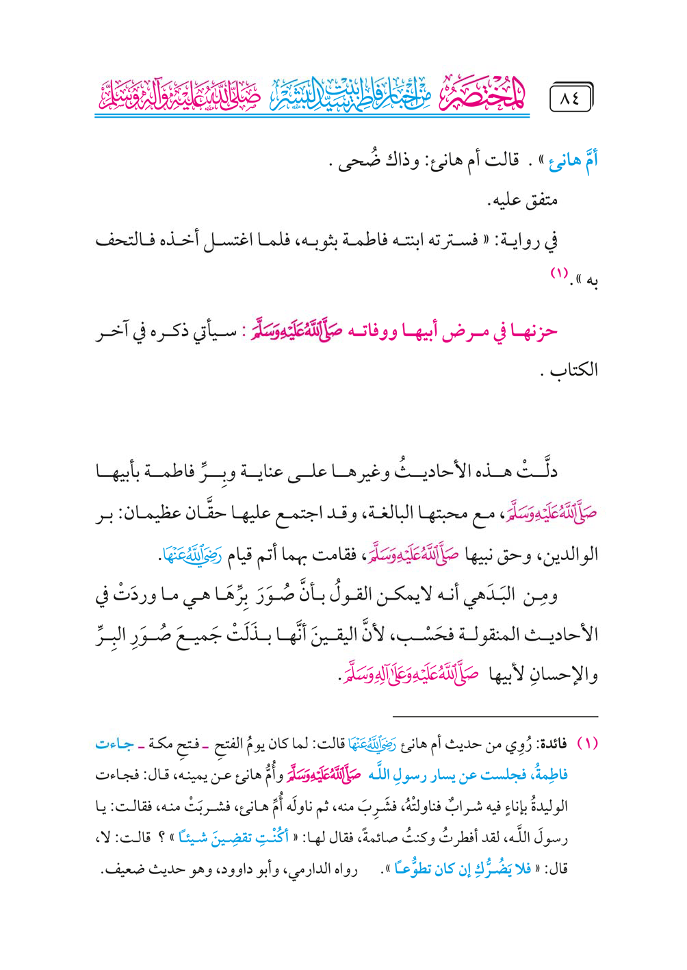 دلَّتْ هذه الأحاديثُ وغيرها على عناية وبِرِّ فاطمة بأبيها - صلى الله عليه وسلم -، مع محبتها البالغة، وقد اجتمع عليها حقَّان عظيمان: بر الوالدين، وحق نبيها - صلى الله عليه وسلم -، فقامت بهما أتم قيام - رضي الله عنها -.