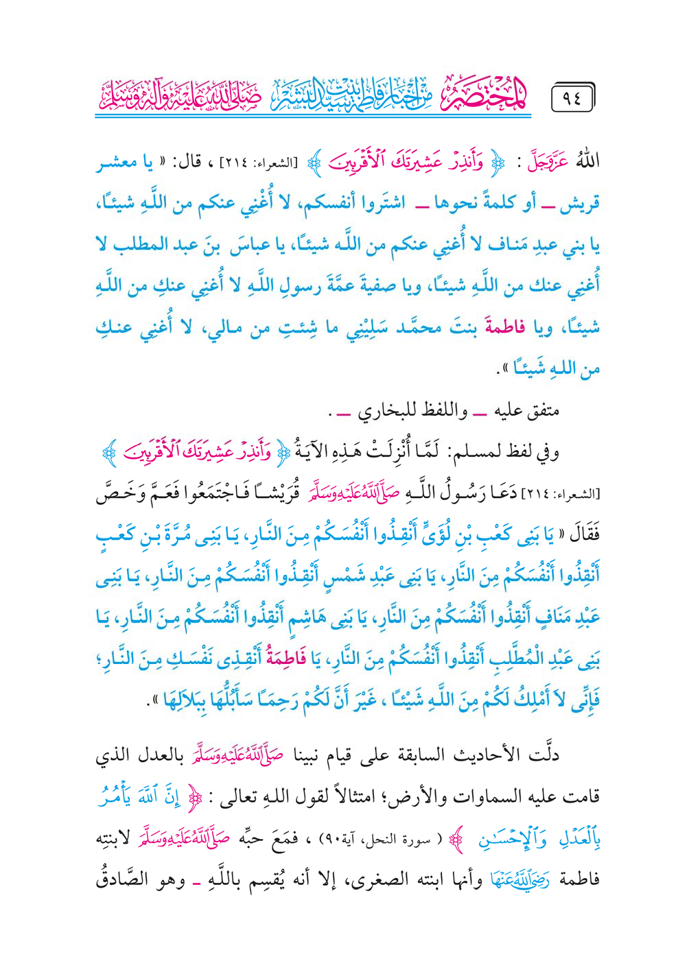 اللهُ - عز وجل -: {وَأَنْذِرْ عَشِيرَتَكَ الْأَقْرَبِينَ} [الشعراء: ٢١٤]، قال: «يا معشر قريش ــ أو كلمةً نحوها ــ اشتَروا أنفسكم، لا أُغْنِي عنكم من اللَّهِ شيئاً، يا بني عبدِ مَناف لا أُغنِي عنكم من اللَّه شيئاً، يا عباسَ بنَ عبد المطلب لا أُغنِي عنك من اللَّهِ شيئاً، ويا صفيةَ عمَّةَ رسولِ اللَّهِ لا أُغنِي عنكِ من اللَّهِ شيئاً، ويا فاطمةَ بنتَ محمَّد سَلِيْنِي ما شِئتِ من مالي، لا أُغنِي عنكِ من اللهِ شَيئاً».