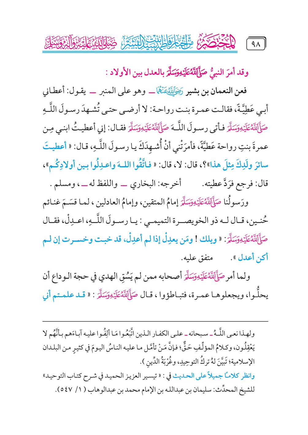 فعن النعمان بن بشير - رضي الله عنهما - ــ وهو على المنبر ــ يقول: أعطاني أبي عَطِيَّةً، فقالت عمرة بنت رواحة: لا أرضى حتى تُشهدَ رسولَ اللَّهِ - صلى الله عليه وسلم - فأتى رسولَ اللَّهَ - صلى الله عليه وسلم - فقال: إني أعطيتُ ابني مِن عمرةَ بنتِ رواحة عَطيَّةً، فأمرَتْني أنْ أُشهِدَكَ يا رسولَ اللَّهِ، قال: «أعطيتَ سائرَ ولَدِكَ مِثلَ هذا»؟ ، قال: لا، قال: «فاتَّقُوا اللهَ واعدِلُوا بين أولادِكُم»، قال: فرجع فرَدَّ عطيته. أخرجه: البخاري ــ واللفظ له ــ، ومسلم.