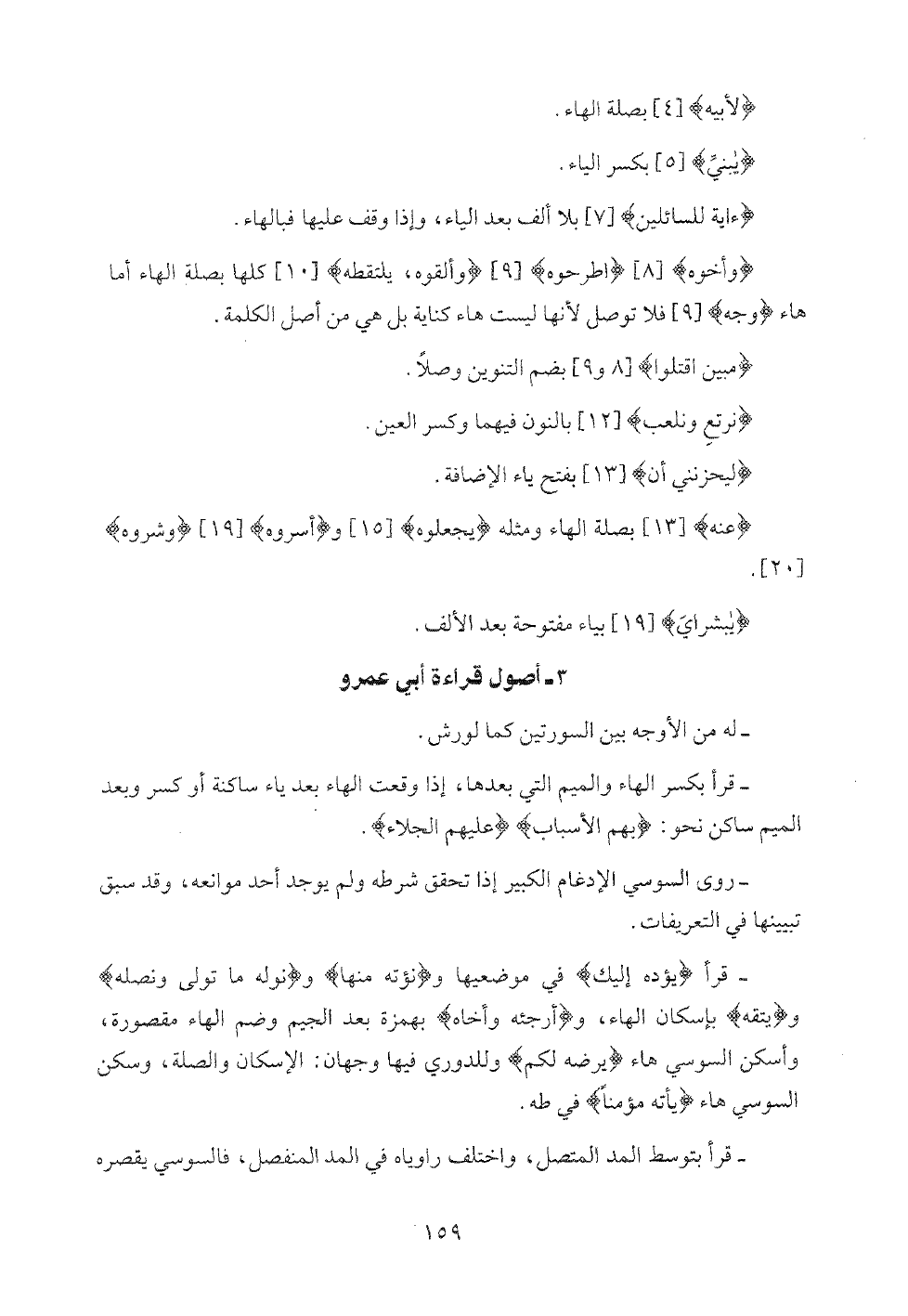 - وروى رويس قصر هاء بِيَدِهِ في مواضعها الأربعة [البقرة: 237 و 249 والمؤمنون: 88 ويس: 83]، وقصر هاء يَأْتِهِ مُؤْمِناً [طه: 75] وروى روح إسكان هاء يَأْتِهِ.