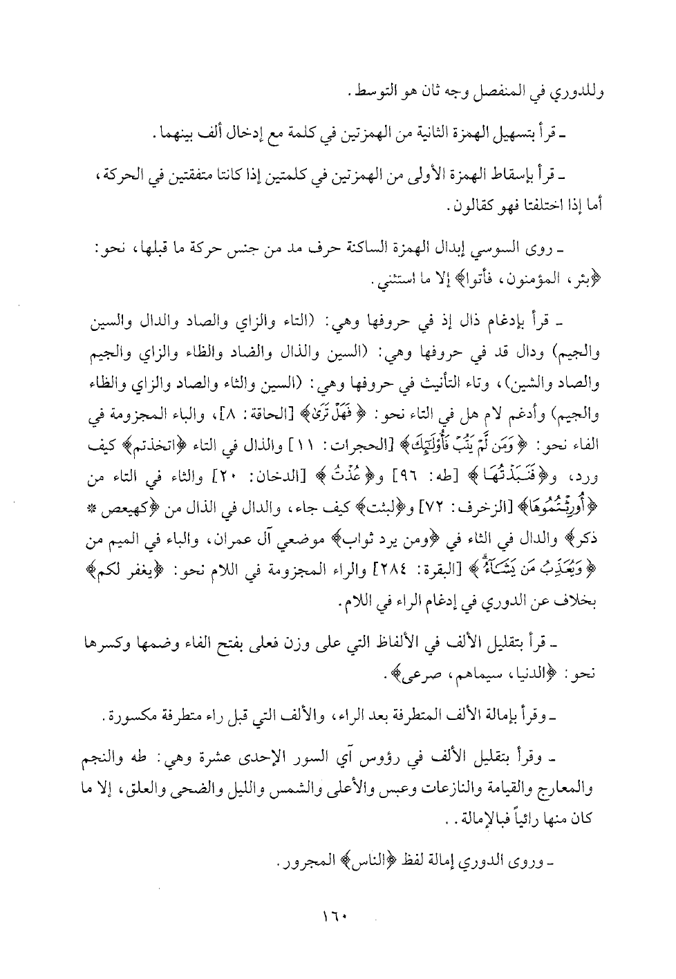 - وقف بإثبات الياء على ما حذفت ياؤه رسما ووصلا في أحد عشر لفظا في سبعة عشر موضعا هي: وَمَنْ يُؤْتَ الْحِكْمَةَ [البقرة: 269] حيث قرأ بكسر التاء وَسَوْفَ يُؤْتِ اللَّهُ [النساء: 146]، وَاخْشَوْنِ الْيَوْمَ [المائدة: 3]، يَقُصُّ الْحَقَّ [الأنعام: 57] حيث قرأ بالضاد المكسورة وصلا، ونُنْجِ الْمُؤْمِنِينَ [يونس: 103]، بِالْوادِ الْمُقَدَّسِ [طه: 12 والنازعات: 16]، ولَهادِ الَّذِينَ آمَنُوا [الحج: 54]، ووادِ النَّمْلِ [النمل: 18]، والْوادِ الْأَيْمَنِ [القصص: 30]، وبِهادِ الْعُمْيِ [الروم: 53]، ويُرِدْنِ الرَّحْمنُ [يس: 23]، وصالِ الْجَحِيمِ [الصافات: 163]، ويُنادِ الْمُنادِ [ق: 41] وتُغْنِ النُّذُرُ [القمر: 5]، والْجَوارِ [الرحمن: 24 والتكوير: 16].