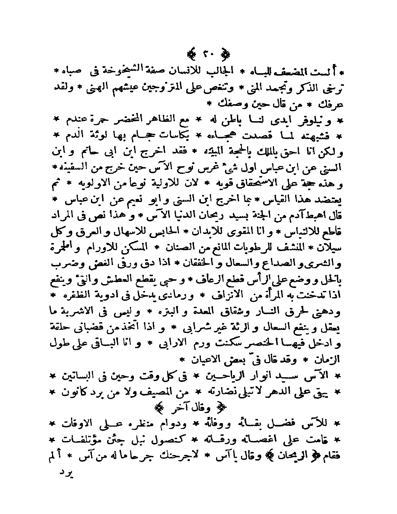 وهذا نص في المراد قاطع للالتباس، وأنا المقوي للأبدان الحابس للإسهال والعرق وكل سيلان، المنشف من الرطوبات، المانع من الصنان، المسكن للأورام والحمرة والشري والصداع والخفقان، إذا دق ورقي الغصن وضرب بالخل على الرأس قطع الرعاف، وجبي يقطع العطش والقيء، وينفع إذا تدخنت به المرأة من الإنزاف ورمادي يدخل في أدوية الظفرة، ودهني لحرق النار وشقاق المعدة والبترة، وليس في الأشربة ما يعقل وينفع السعال والرئة غير شرابي، وإذا أخذ من قضباني حلقة وأدخل فيها الخنصر سكنت ورم الأرابي، وأنا الباقي على طول الزمن.