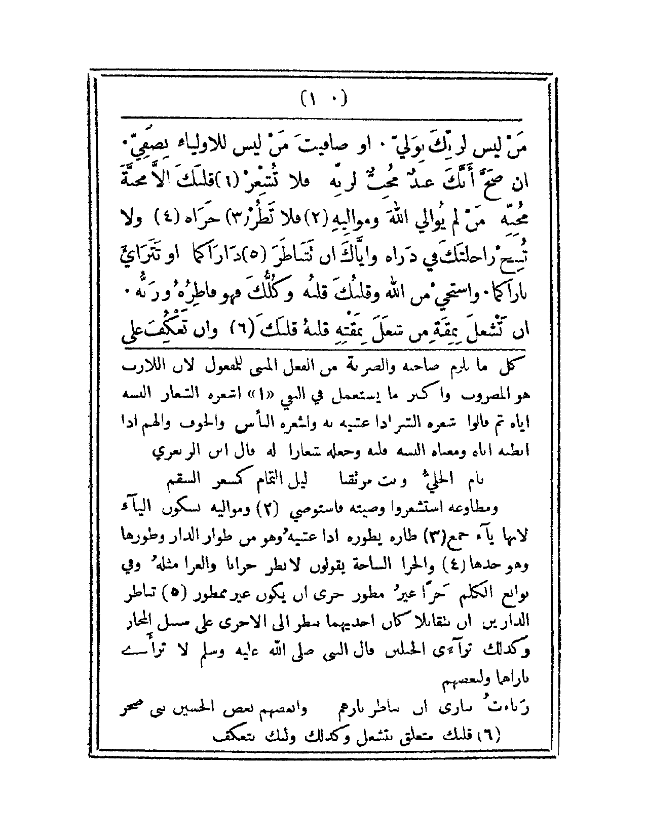 مَن ليسَ لربِّك لِوليّ أو صافيتَ من ليسَ للأولياءِ بصفي. إن صحَّ أنّكَ عبدٌ محبٌ لربّهِ فلا تُشعِرْ قلبكَ إلا محبّةً محبّه. مَن لم يُوالي اللهَ ومواليهِ فلا تَطُرْ حَراه ولا تُنِخْ راحلتِكَ في ذَراه. وإيّاكَ أن تتناظَر داراكُما أوْ تتراءى ناركُما واستحي منَ اللهِ وقلبُكَ قلبُه وكُلكَ فهوَ فاطرُه وربه أن تشغَلَ بمقةِ مَن شَغَلَ بمقتهِ قلبَهُ قلبَك وأنْ تعكُفَ على