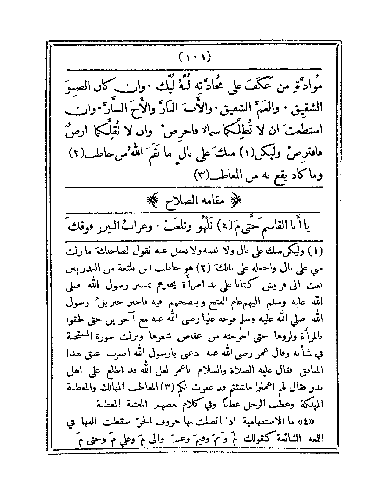 مُوادَّةِ من عكفَ على محادَّته لُبهُ لُبك وإن كانَ الصِّنوَ الشقيق والعمَّ الشقيق والأبَ البار والأخَ السّار وإنِ استطعتَ أن لا تُظلِكُما سماءٌ فاحرِص. وأن لا تقلِكُما أرضٌ فافترِص وليكُن منكَ على بالٍ ما نَقَمَ اللهُ من حاطِب وما كادَ يقعُ بهِ منَ المعاطِب.