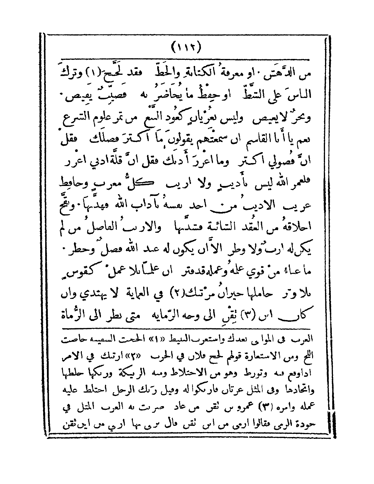 منَ الدَّهش أو معرفةُ الكتابةِ والخط. فقد لججَ وتركَ الناسَ على الشّط. أو حفِظُ ما يحاضرُ به فصيّبُ يفيض وبحرٌ لا يغيض. وليس بعريانٍ كعودِ النبعْ من ثمرِ علومِ الشّرع نعم يا أبا القاسم إن سمعتهُم يقولونَ ما أكثرَ فضلكَ فقلْ إنَّ فُضولي أكثر وما أغزَر أدبكَ فقلْ إنَّ قلة أدبي أغزَر فلعَمُر اللهِ ليسَ بأديبٍ ولا أريب. كلُّ مُغربٍ وحافظِ غريب. الأديبُ مَن أخذَ نفسَهُ بآدابِ اللهِ فهذَّبها ونقحَ أخلاقهُ منَ العُقدِ الشّاثنةِ فشذَّبها. والأريبُ الفاضلُ مَن لم يكنْ لهُ أرَبٌ ولا وطر. إلا أن يكونَ لهُ عندَ اللهِ فضلٌ وخطَر. ما غناءُ مَن قويَ علمهُ وعملهُ قد فترَ. إنَّ عِلماً بلا عملٍ كقوسٍ بلا وتَر. حامِلُها حيرانُ مُرتبِك في العماية لا يهتدي وإن كان ابن تقنٍ إلى وجهِ الرَّماية متى نظرَ إلى الرُّماة