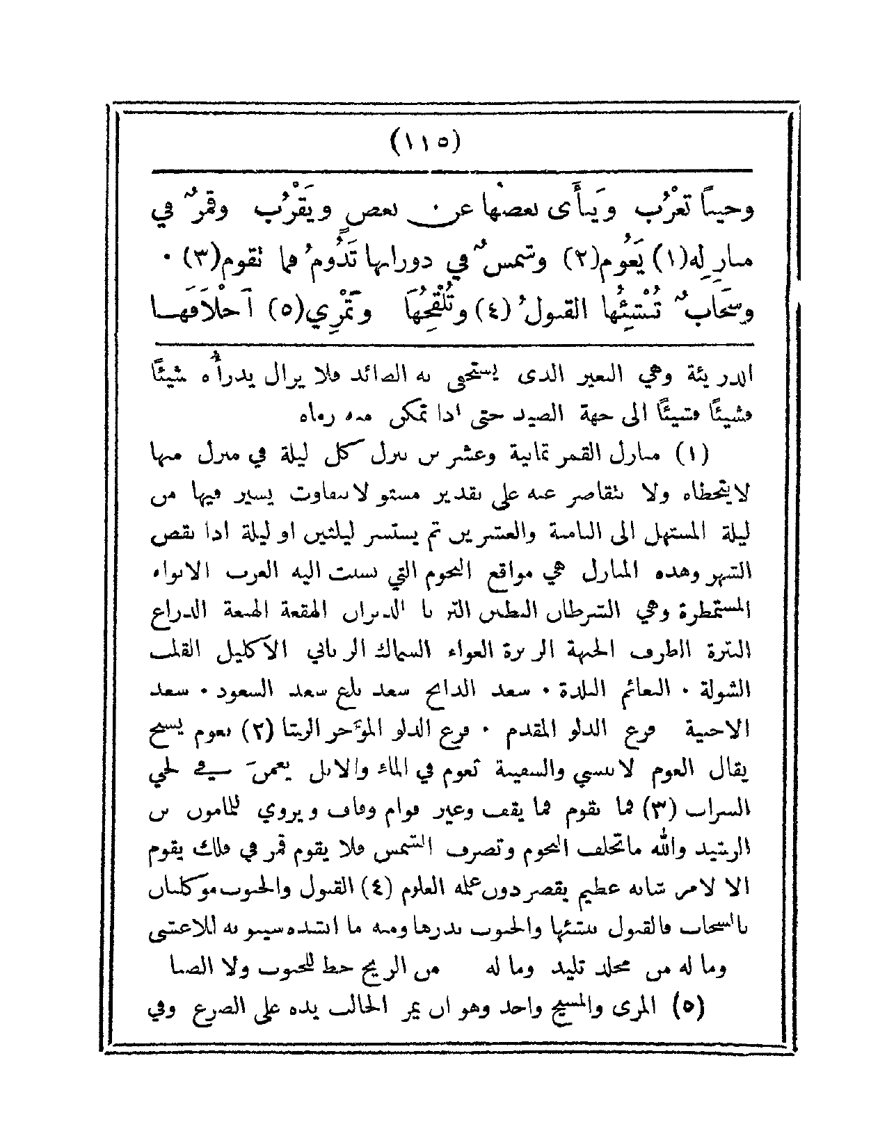 وحيناً تغرُب وينأى بعضُها عن بعضٍ ويقرُب وقمرٌ في منازلهِ يعوم وشمسٌ في دورانها تدومُ فما تقوم وسحابٌ تُنشئُها القُبول وتُلحُقها وتمري أخلافَها
