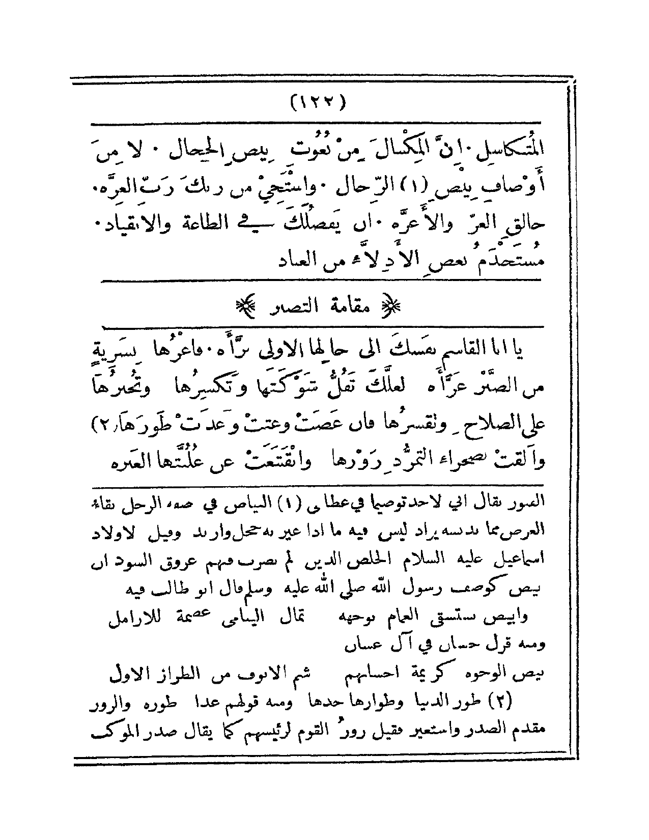 يا أبا القاسم نفسُك إلى حالها الأولى نزَّأة فاغزُها بسريّةٍ من الصبرِ غزَّأة. لعلّكَ تفلُّ شوكتَها وتكسِرُها. وتجبُرها على الصَّلاحِ وتقسرُها فإن عصتْ وعتتْ وعدَتْ طوْرَها. وألقَتْ بصحراءِ التمرد زَوْرَها وانقشعتْ عن غُلُبتّها.