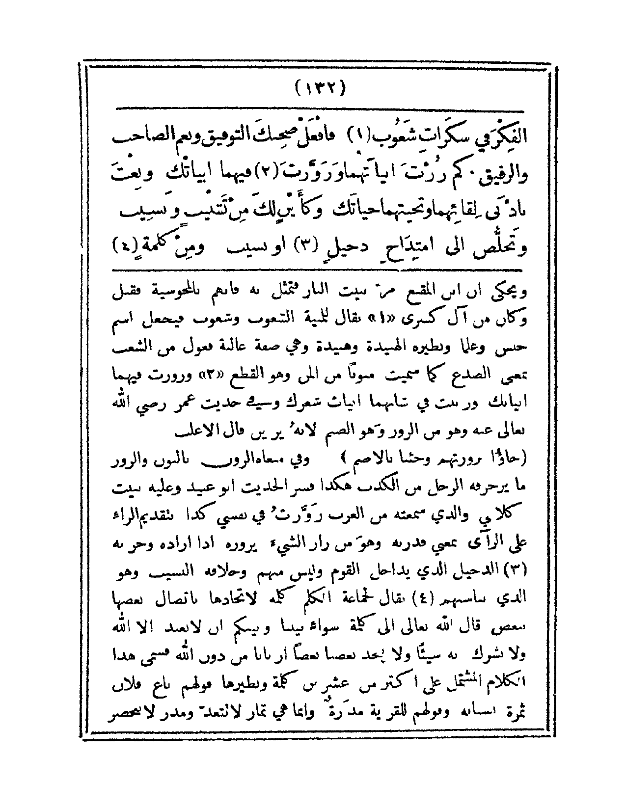 الفكرَ في سكراتِ شَعوبْ فافعلْ صحبِكَ التّوفيق ونِعمَ الصَّاحبُ والرَّفيق كم زُرْتَ أبياتهما وزوَّرْتَ فيهِما أبياتَك وبعتَ بأدنى لقائِهما وتحيتهِما حياتَك. وكأيّنْ لكَ من تشبيبٍ ونسيب وتخلصٍ إلى امتداحِ دخيلٍ أو نسيب ومنْ كلمةٍ