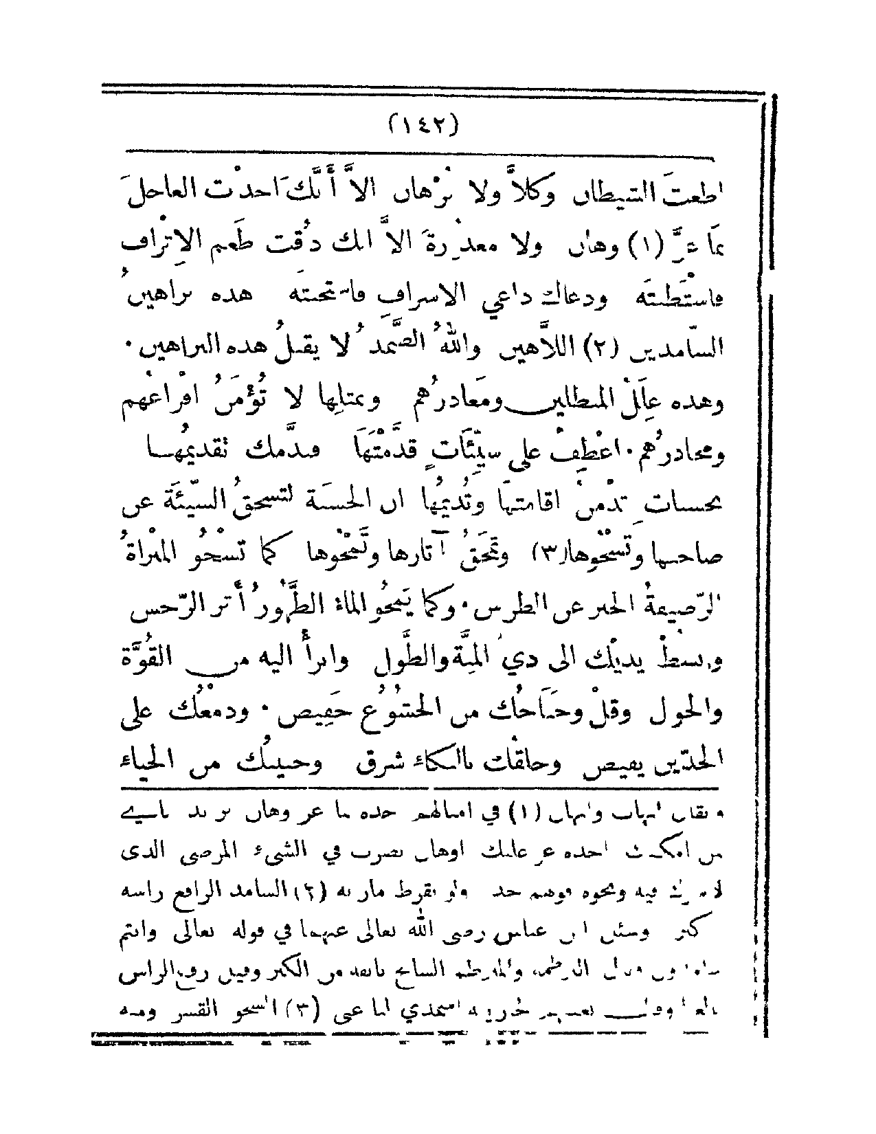 أطعتَ الشَيطان وكَلاَّ ولا بُرهان إلاَّ أنّك أخذتَ العاجِلَ بما عَزَّ وهان. ولا معذرَةَ إلاَّ أنَكَ ذُقتَ طعمَ الإترافِ فاستطبْتَه. ودعاكَ داعي الإسرافِ فاستجبتَه هذه براهينُ السامدينَ اللاَّهين. واللهُ الصَّمَدُ لا يقبَلُ هذهِ البراهين وهذهِ عِللُ المبطلينَ معاذِرُهم. وبمثلها لا تؤمَنُ أفزاعُهم ومحاذِرُهم. اعطفْ على سيِّئات قدَّمْتَها فندَّمَكَ تقديمُها بحسناتٍ تُدمنُ إقامتَها وتُديمُها. إنَّ الحسنَةَ لتَسحَقُ السَّيئَةَ عن صاحبِها وتَسحُوها. وتمحَقُ آثارَها وتمحوها. كما تَسحو المِبراةُ الرَّصيفةُ الحِبرَ عنِ الطَّرْس. وكما يمحو الماءُ الطُهورُ أثَرَ الرَّجْس وابسُطْ يديكَ إلى ذي المنةِ والطّوْل. وابرَأ إليهِ منَ القوَّةِ والحوْل. وقُل وجناحُكَ منَ الخُشوعِ خفيض. ودمعُكَ على الخدَّيْنِ يفيض. وحلقُكَ بالبُكاءِ شرِق. وجبينُكَ مِنَ الحياءِ