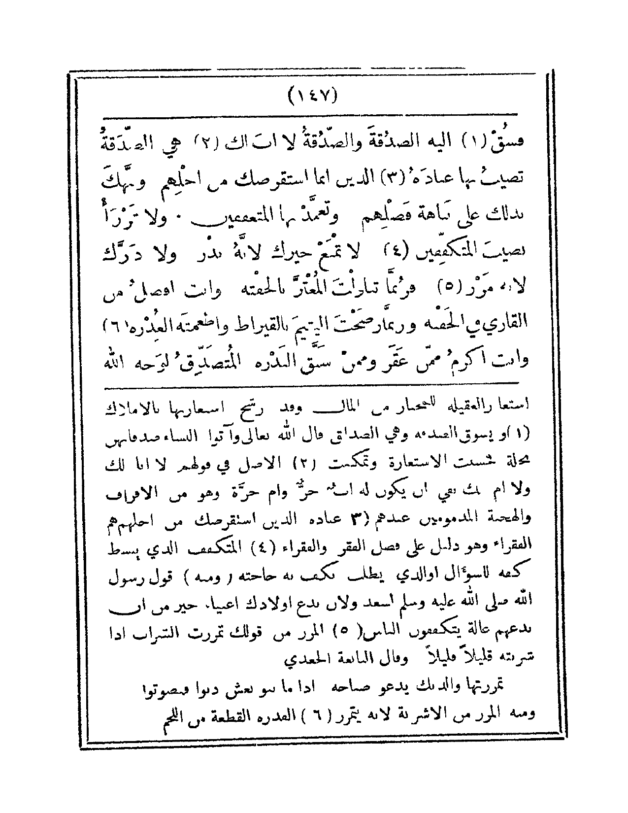 فَسُق إليهِ الصَّدُقة والصَّدقَةَ لا أبَ لك. هيَ الصَّدَقةُ تُصيبُ بها عبادهُ الّذينَ إنما استقرَضَكَ من أجلهِم ونبهكَ بذلكَ على نباهةِ فضلهِم. وتعمدَ بها المتعفِّفين. ولا ترزأ نصيبَ المتكففين. لا تمنع خيرَكَ لأنّهُ نَذرْ ولا دَرَّكَ لأنّهُ مَزْر فرُبما تناولتَ المُعْترَّ بالحفنة وأنتَ أفضلُ مِن القاري في الجْفنة ورُبّما رضَختَ اليتيمَ بالقيراطِ وأطعمتَهُ الفِدرَه وأنتَ أكرَمُ ممّن عقَرَ وممّن سبقَ البدْرَه المتصدِّقُ لوجهِ الله