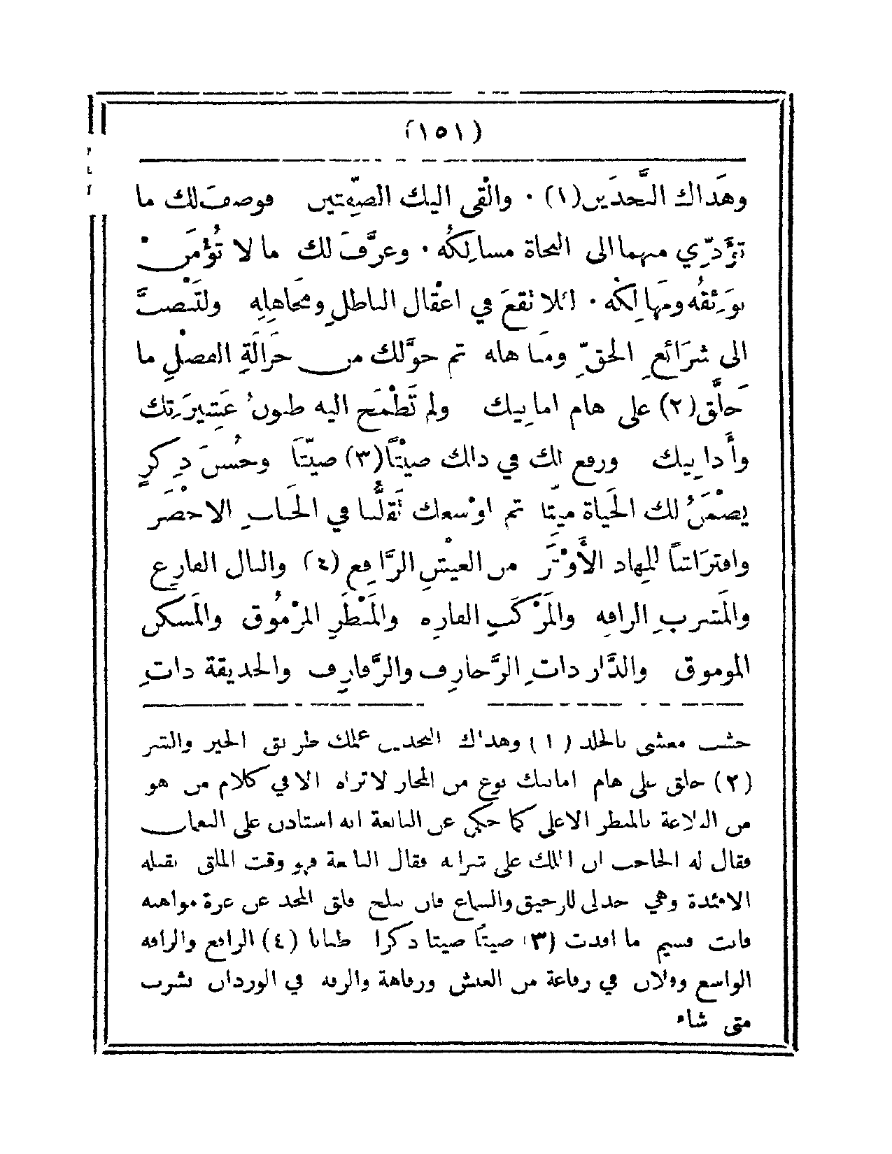 وهَداكَ النجدَين. وألقى إليكَ الصِّفَتين فوصفَ لكَ ما تؤدِّي منهُما إلى النّجاة مسالكُه. وعرَّفَ لكَ ما لا تؤمَنُ بَوائقهُ ومهالكهُ. لئلاَّ تقعَ في أعقالِ الباطلِ ومجاهله. ولتنصَبَّ إلى شرائعِ الحقِّ ومناهلهِ. ثمَّ خوَّلكَ من جزالةِ الفضلِ ما حلقَ على هامِ أمانيك. ولم تطمَحْ إليهَ ظُنونُ عشيرَتكَ وأدانيك. ورفعَ لكَ في ذلكَ صيتاً صيّتا. وحُسنَ ذكرٍ يضمنُ لكَ الحياةَ ميِّتا ثمَّ أوسعكَ تقلباً في الجنابِ الأخضر. وافتراشاً للمِهادِ الأوثر. منَ العيشِ الرَّافغِ والبالِ الفارغ والمشربِ الرَّافهِ. والمركبِ الفاره والمنظر المرموق والمسكنِ الموموق والدَّارِ ذاتِ الزَّخارفِ والزَّفارِف. والحديقةِ ذاتِ