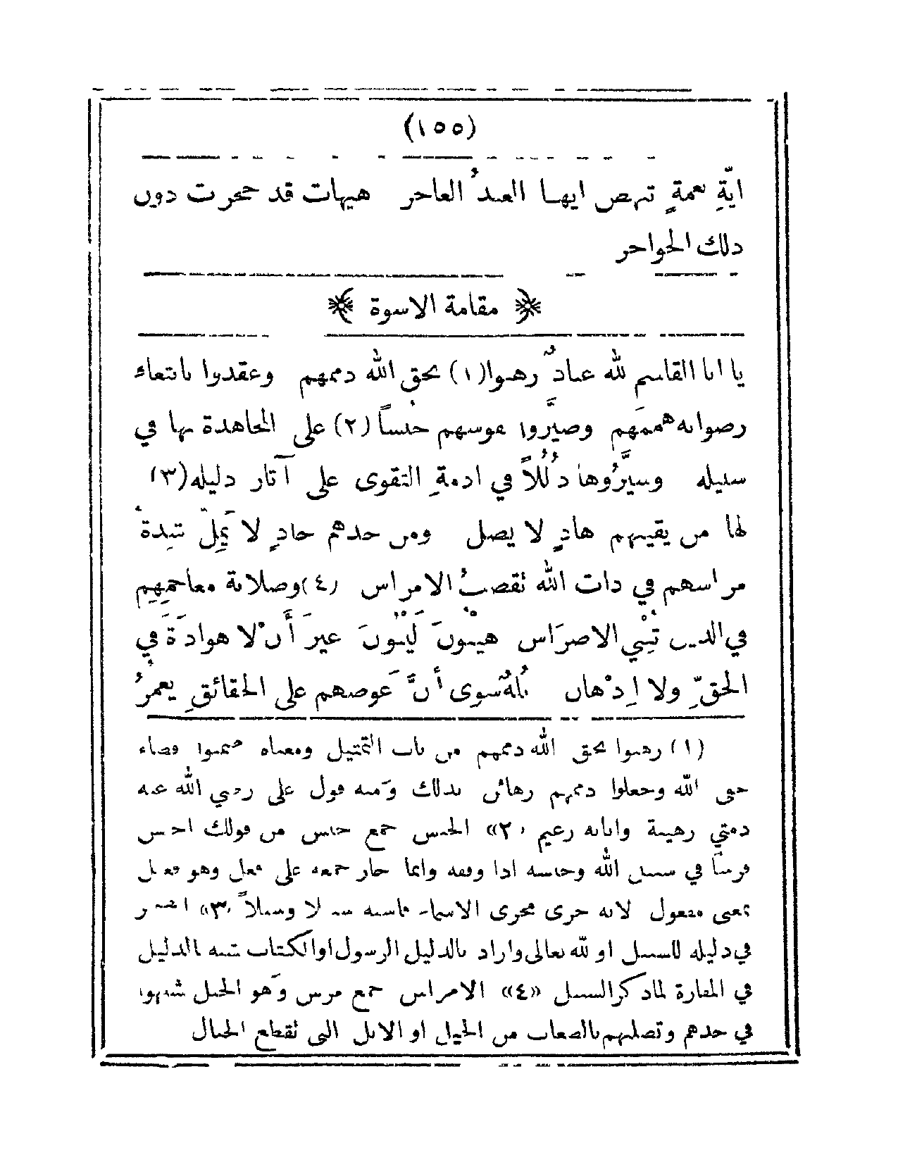يا أبا القاسم للهِ عبادٌ رَهنوا بحقِّ الله ذِمَمِهُم. وعقدوا بابتغاءِ رِضوانهِ هِمَمِهُم. وصيروا نُفوسَهُم حُبُساً على المُجاهدةِ بها في سبيلِه. وسيروها ذُللاً في أزمةِ التقوى على آثارِ دليله. لها مِن يقينِهم هادٍ لا يَضل ومِن جدِّهم حادٍ لا يُمل. شِدَّةُ مِراسهِم في ذاتِ اللهِ تَقضِبُ الأمراس. وصَلابةُ معاجمهِم في الدِّينِ تُنبي الأضراس. هَينونَ ليْنون غيرَ أن لا هَوادةَ في الحقِّ ولا إدهان. بُلهٌ سِوى أنَّ غوْصَهم على الحقائقِ يعمر