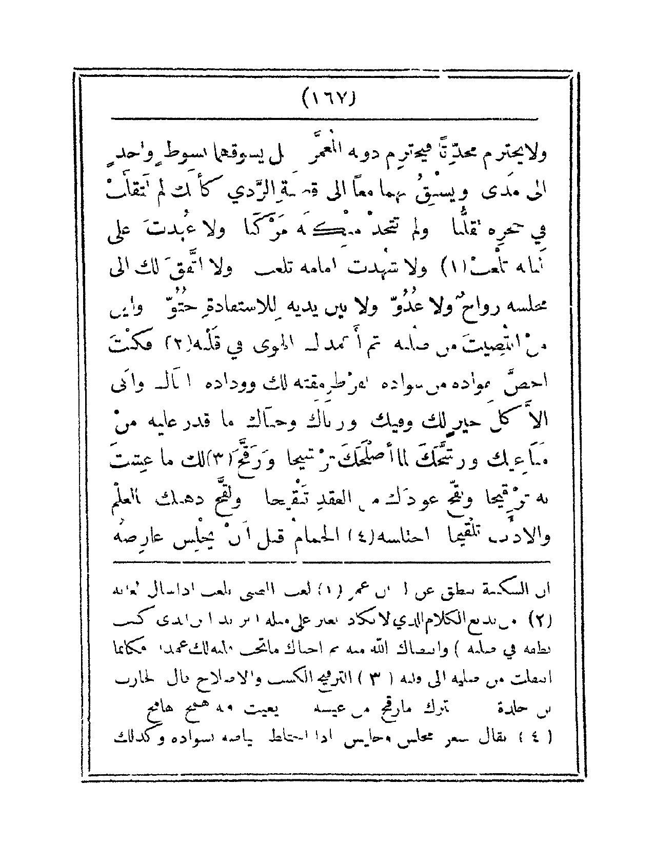 ولا يحترِمُ مُحدثاً فيخترِمَ دونهُ المُغمر بل يسوقُهُما بسوطٍ واحدٍ إلى مدى ويسبقُ بهما معاً إلى قصبةِ الرَّدى كأنكَ لم تتقلب في حجرهِ تقلباُ ولم تتخذ منكبِهُ مركَبا. ولا عُهدتَ على لبانهِ تلعَب. ولا شُهِدْت أمامهُ تلعب ولا اتفقَ لكَ إلى مجلسهِ روَاحٌ ولا غُدُو. ولا بينَ يديهِ للاستفادةِ جُثُو. وأينَ مَنِ انتُضيتَ مِن صُلبه ثمَّ أغمدكَ الهوى في قلبه فكنُتَ أخَصَّ بِفؤاده منْ سوَاده لِفرط مقته لكَ وَوداده أباكَ وأبي إلا كُلَّ خير لكَ وفيك. وَرَبّاكَ وحَبَاكَ ما قَدَرَ عليه منْ مَبَاغيك ورشْحكَ لِما أصْلحَكَ ترشيحاً ورقّحَ لكَ ما عِشتَ به تَرْقيحاً. ونَقّحَ عُودَكَ منَ العُقَد تنَقيحاً ولقّحَ ذهنك بالعلِم والأدب تَلقيحاً. اختلسَهُ الحِمامُ قبلَ أنْ يُخلِسَ عارضُهْ