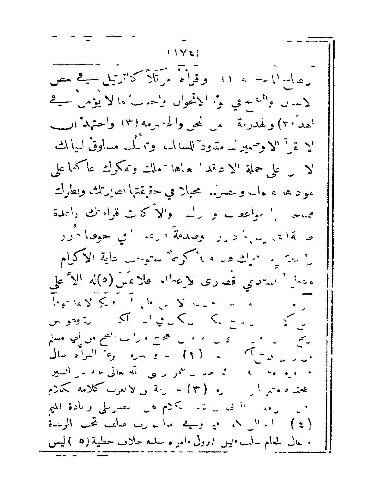 ارْتِضاخِ اللكْنَةْ وَاقْرَأْهُ مُرَتّلاً كالتّرْتيلِ في بعْضِ الأسْنانْ والتّفْليِجِ في نَوْرِ الأُقحُوَانْ وَاجْتَنَبْ ما لا يُؤْمَنُ في الهِذّ والهَذْرَمَهْ. مِنَ اللّحْنِ وَالحَضْرَمَه وْاجْتَهِدْ أنْ لا تَقْرَأ إلا وضَمِيرُكَ مُقاوِدٌ للِسانِكْ وَتَبَينُكَ مُساوِقٌ لِبَيانِكْ لا تَمُرَّ على جُمْلَةٍ إلا عاقِداً بمِعْناها تأملَكَ وتَفَكُّرَكْ عاكِفاً على مُؤَادَّها تَفَهُمَكَ وتَبَصُرَكْ. مُجِيلاً في حقيقتِها بَصيرَتَكَ ونظرَكْ. مُمْتاحاً منها مَواعِظَكَ وَعِبَرَكْ وإلا كانَتْ قِراءتُكَ رَاعِدَةَ صَلِفَةً لَيْسَ لهَا دَرَرْ وَصَدَفَةً فارِغةً ما في جَوْفِها دُرَرْ. وَأكْرِمْ نَجيّكَ هذَا فإنّهُ كَرِيمٌ يَسْتوْجِب غايةَ الإكرَامْ وعظيمٌ يَسْتدْعِي قُصارَى الإعظامْ. فلا تَمَسّ لَهُ إلا على
