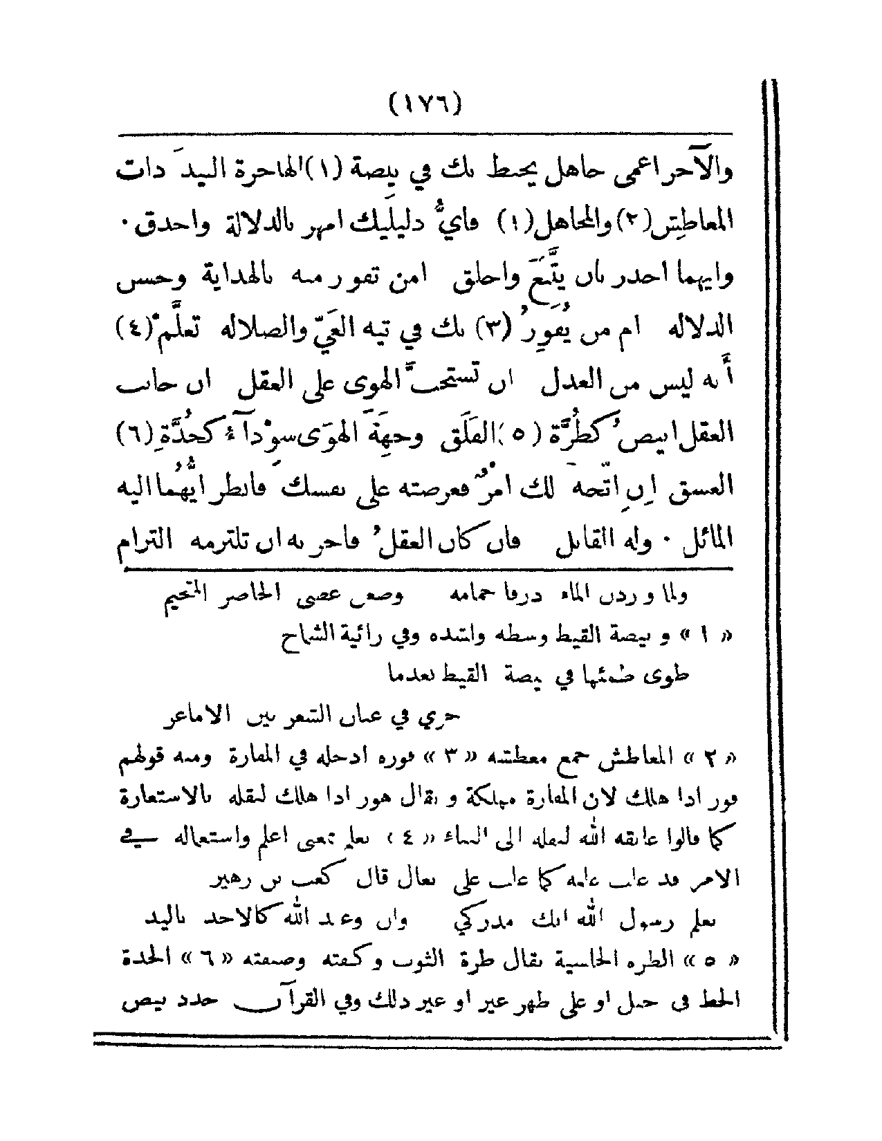 والآخَرُ أعمَى جاهِلٌ يخبِطُ بِكَ فيِ بَيضةِ الهَاجِرَةِ البيِدَ ذَاتَ المَعاطِشِ والمجَاهِلْ فأي دَلِيليَكَ امهَرُ بِالدَّلالَةِ وَأحذَقْ وَأيهُما أجْدَرُ بِأنْ يُتَبعَ وَأخْلَقْ أمَنْ تَفُوزُ منْهُ بِالهدَايةِ وَحُسْنِ الدَّلالَةْ أمْ مَنْ يُفَوِّزُ بكَ في تيهِ الغَيِّ وَالضَّلالَةْ تَعَلّمْ أنّهُ ليَسَ منَ العدلْ أنْ تَسْتَحِبَّ الهَوى على العَقْلْ إنَّ جانِبَ العقْلِ أبَيضُ كَطُرَّةِ الفَلقْ وَجِهَةَ الهَوَى سَودَاءُ كجُدَّةِ الغَسَقْ إنِ اتّجَهَ لكَ أمْرٌ فَعَرَضتَهُ على نفسِكَ فانظُرْ أيُهما إلَيْهِ المائِلْ. ولَهُ القابِلْ فإن كانَ العقلَ فأحرِبِهِ أنْ تَلْنَزِمَهُ الْتِزَامَ