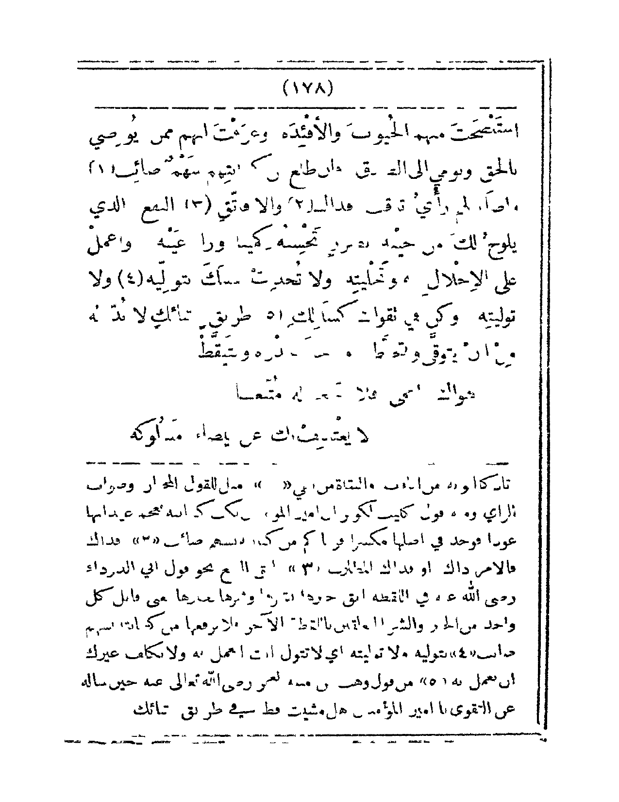اسْتَنْصَحْتَ منْهُمُ الجُيُوبَ والأفْئِدَةْ. وَعَرَفْتَ أنّهُمْ مِمّنْ يُوصِي بِالْحَقَ وَيُومِيِ إلى الصِّدْقِ. فإنْ طَلَعَ مِنْ كِنانَتِهِمْ سَهْمٌ صائبْ وَأضاءَ لَهُمْ رَأيٌ ثاقِبْ فَذَاكَ وإلا فاتّقِ النّفْعَ الذّي يَلُوحُ لَكَ مِنْ جَيْبِهْ بضَررٍ تحسَبُهُ كميناً وَرَاءَ غيْبِهْ واعمَلْ على الإخلالِ بهِ وَتخْلِيتَهْ وَلا تُحَدِّثْ نَفْسَكَ بِتَوَلِّيهِ ولا تَوْلِيَتِهْ وَكُنْ في تَقْوَاكَ كَسالِكِ طَريِقٍ شائِكٍ لا بُدَّ لَهُ مِنْ انْ يَتَوَقّى وَيَتَحَفّظْ وَيأخُذَ حِذْرَهُ وَيتيقّظْ.