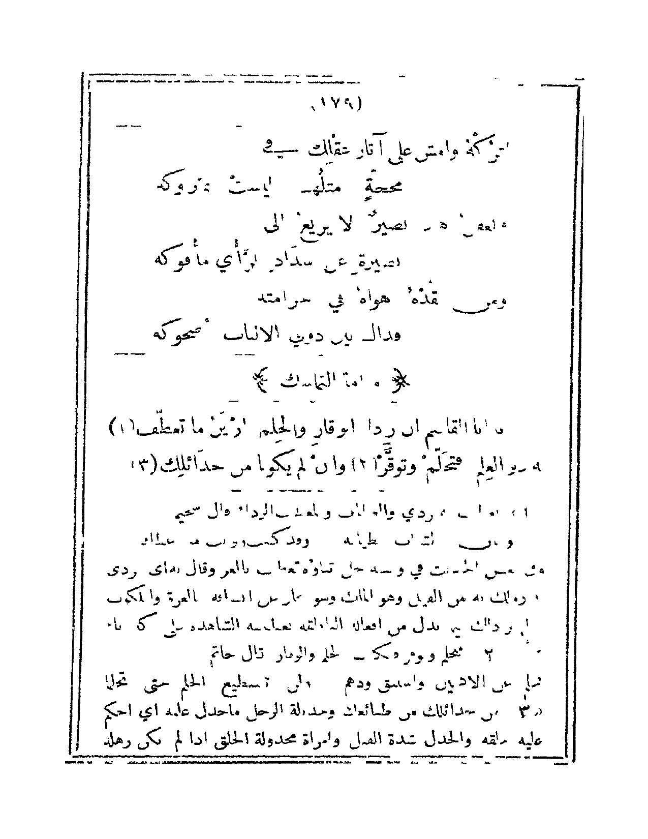 يا أبا القاسم إنَّ رِدَاءَ الوَقارِ وَالحِلْمْ. أزْيَنُ ما تَعَطّفَ بهِ ذُو العِلْمْ فَتَحَلّمْ وتَوَقّرْ وإنْ لَمْ يُكُونا مِنْ جدائلكْ