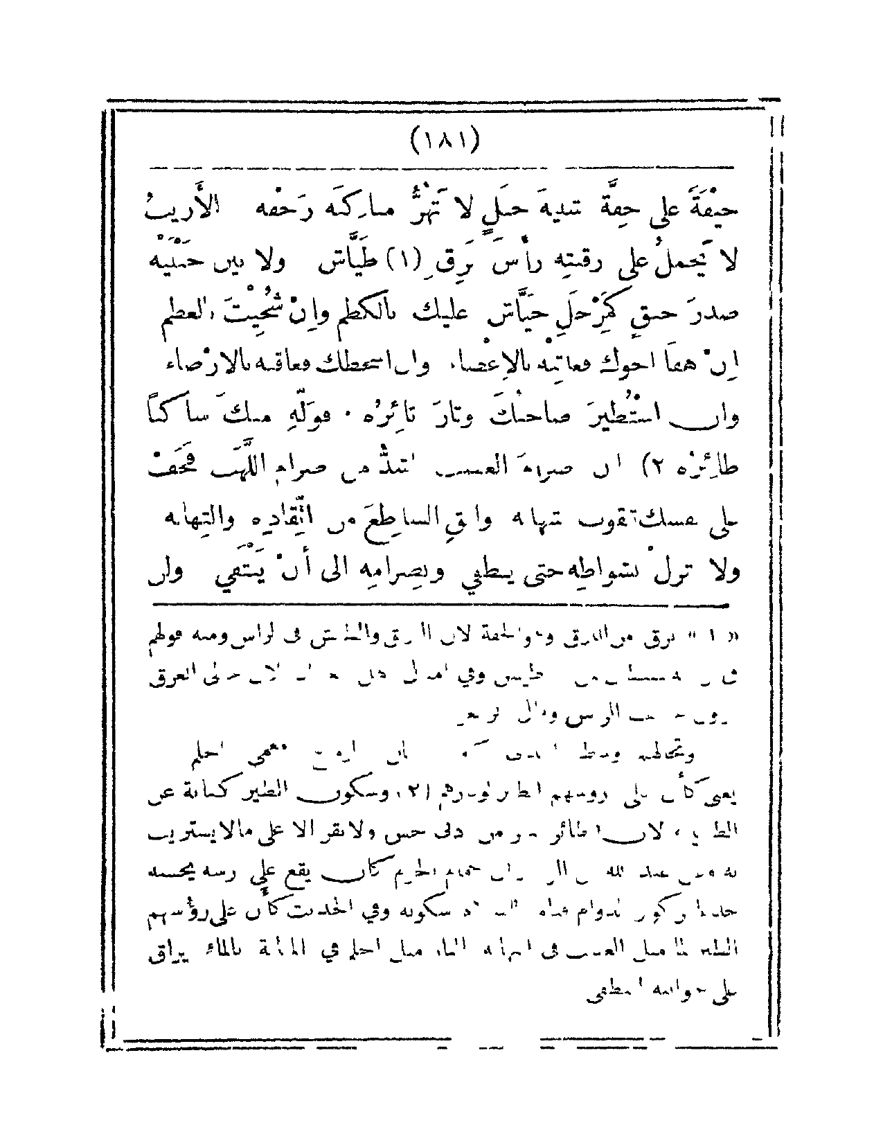 خِيْفَةٌ على خِفّهْ. شَبِيه جَبَلٍ لا تَهُزُّ منَاكبَهُ رَجْفَهْ. الأرَيبُ لا يَحْمِلُ على رَقَبِتهِ رَأسَ نَزِقٍ طَيّاشْ. وَلا بَينَ جَنَبيهِ صَدْرَ حَنِقٍ كَمِرْجَلٍ جَيّاشْ. عَلَيْكَ بِالْكَظمْ وإنْ شُجِيْتَ بِالْعَظمْ إنْ هَفَا أخُوكَ فَعَاتِبْهُ بالإغْضاءْ. وإنْ أسْخَطَكَ فَعَاقِبْهُ بالإرضَاءْ وإنِ اسْتُطيرَ صاحُبكَ وثارَ ثائِرُهْ فَوَلِّهِ مِنْكَ ساكِناً طائِرُهْ إنَّ ضِرَامَ الغَضَبْ أشَد مِنْ ضِرَامِ اللهَبْ فَخَفْ على نفسِكَ ثَقُوبَ شهابِهْ. واتّقِ السّاطعَ مِنَ اتِقادِهِ والتْهابِهْ. وَلا تَزَلْ بشُواظِهِ حَتّى يَنْطفِي. وَبِضِرَامِهِ إلى أن يَنْتفِي. ولَنْ