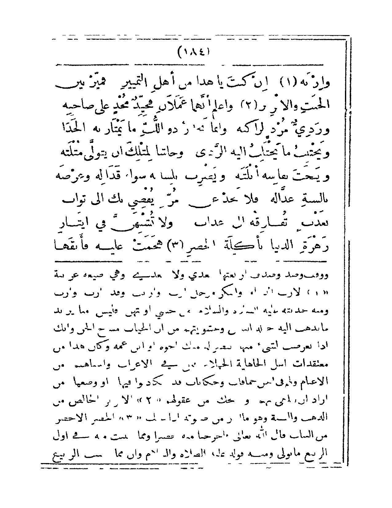 وَإرْبَهْ. إنْ كُنتَ يا هذا مِنْ أهْلِ التمْيِيزْ فَمَيزْ بينَ الخَبَثِ والإبرِيزْ واعْلَمْ أنهُما عَمَلانِ فَجيِّدٌ مُجْدٍ على صاحِبِهْ وَرَدِيٌ مُرْدٍ لِرَاكِبِهْ. وَإنما يختارُ ذُو اللبِّ ما يَمتارُ بهِ الجَدَا. ويَجْتَنِبُ ما يجْتَلبِ إليْهِ الرَّدَى. وَحاشا لمثلكَ أنْ يَتَوَلى مُثْلَتَهْ. وينحِتَ بفأسهِ أثْلتهْ. ويضرِبَ بلسانه سواءَ قذَالِهْ، وَعِرْضَهُ بِألْسِنَةِ عُذّالِهْ فلا تَحِدْ عَنْ مُر يُفْضي بكَ إلى ثوابْ بعَذْبٍ تفارقُهُ إلى عذابْ ولا تُشْبِهَنَّ في إيثَارِ زَهْرَةِ الدنْيا بأكلَةِ الخَضِرِ هجمتْ عليهِ فآنَقَهَا