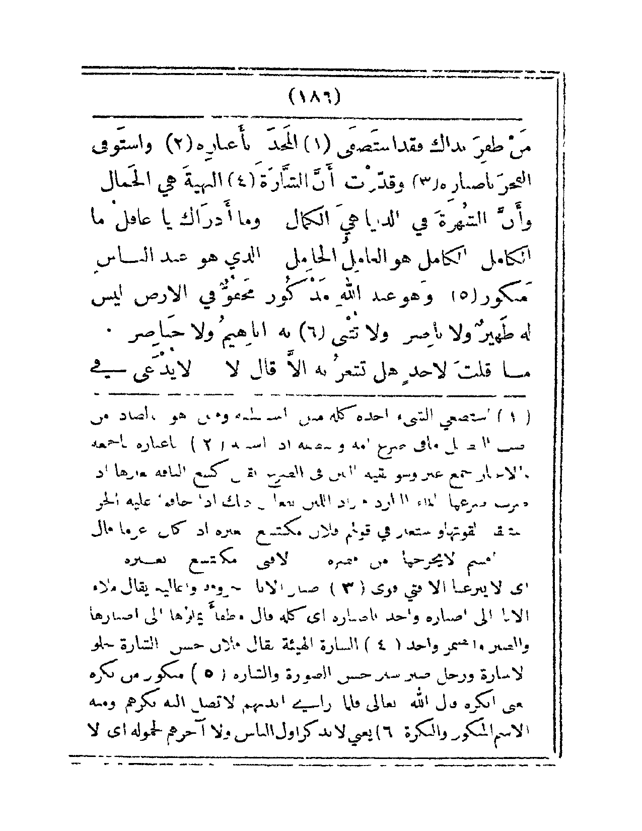 مَنْ ظَفِرَ بذاكَ فَقَدِ استصفَى المجْدَ بأغَبارِهْ. واستوفَى الفَخْرَ بأصْبارِه. وَقَدّرْتَ أنَّ الشارَةَ البهيةَ هيَ الجمالْ. وأنَّ الشهْرَةَ في الدنيا هيَ الكَمالْ. وما أدرَاكَ يا غافِلُ ما الكامِلْ الكامِلُ هُوَ العامِلُ الخامِلْ. الذِي هُوَ عندَ الناسِ منكُورْ وهوَ عندَ اللهِ مذكُورْ. مَجْفُوٌ في الأرْضِ لَيْسَ لهْ ظهيرٌ ولا ناصرْ ولا تُثْني بهِ أباهيمُ وَلا خنَاصِر. ما قُلْتَ لأحَدٍ هَلْ تَشْعُرُ بهِ إلا قالَ لا. لا يُدْعَى في