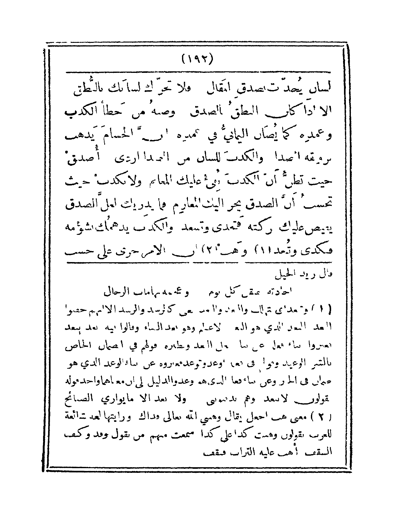 لسانٍ يحدِّثُ بصِدْقِ المقالْ. فلا تُحَرِّكْ لسانَكَ بالنُطقْ إلا إذا كان النطقُ بالصِّدْقْ وَصُنُه من خطأ الكذبِ وعمدِهْ كما يُصانُ اليَمَانُّي في غمدِهْ. إنَّ الحُسامَ يذهبُ برونقِه الصَّدا، والكذبَ للِّسانِ منَ الصَّدأ أرْدَى. أُصْدُقْ حيثُ تظنُ أنَّ الكذبَ يُفيءُ عليكَ المغانم. ولا تكذبْ حيثُ تحسبُ أن الصدقَ يجرُ إليك المغارمْ، فما يُدريكَ لعلَّ الصِّدقَ يُفيض عليكَ بركتهُ فتَجدي وتسعد. والكذبَ يدهُمَكَ بشؤمِهِ فتُكدِيِ وتبعدْ، وهَبْ أن الأمرَ جرى على حسبِ
