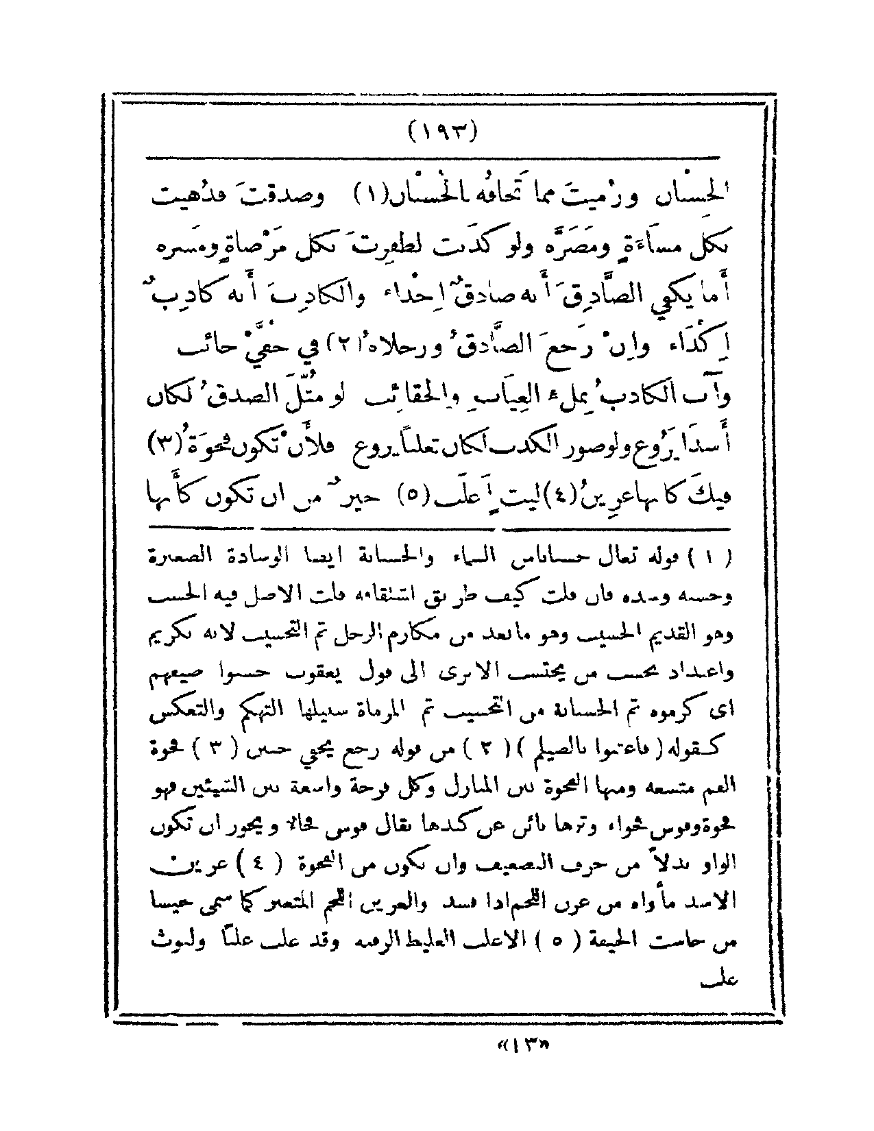 الحِسبانْ، ورُمِيتَ ممّا تخافُهُ بالحُسبان. وصَدَقَتَ فَدُهِيتَ بكُلِّ مساءةٍ ومضرَّة. ولوْكذبْتَ لظفِرْتَ بكُلِّ مرضاةٍ ومسرَّةْ أمَا يكفي الصَّادِقَ أنّهُ صادقٌ إجدَاءْ. والكاذبَ أنّهُ كاذِبٌ إكدَاءْ. وَإنْ رَجعَ الصَّادِقُ وَرِجلاهُ في خُفّيْ خائِبْ. وَآبَ الكاذِبُ بِملءْ العِيابِ والحقائِبْ. لَوْ مُثِّلَ الصِّدْقُ لكانَ أسَداً يَرُوعُ ولَوْ صُوِّرَ الكَذِبُ لكأنَ ثعلباً يَرُوغُ، فلأنْ تكونَ فَجوَةُ فيكَ كأنّها عَرِينُ لَيثٍ أغلَبْ. خَيرٌ منْ أنْ تكونَ كأنّها