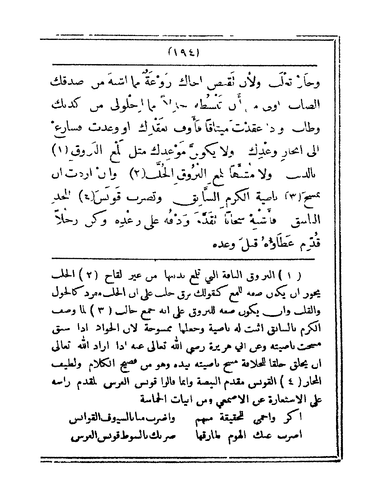 وِجارُ ثَعلَبْ. ولأنْ تَقبِضَ أخاكَ روْعةٌ ممّا أشْبَهَ مِنْ صِدْقِكَ الصَّابْ، أوْلى مِنْ أن تَبْسُطَهُ جَذِلاً ممّا أحولي منْ كَذبِكَ وَطَابْ. وإذا عَقَدْتَ ميثاقاً فأوفِ بعقْدِكْ. أوْ وَعَدْتَ فَسارِعْ إلى إنْجازِ وعدِكْ. ولا يَكونَنّ موعِدُكَ مثلَ لَمْعِ البُروقِ بالذِّنَبْ، ولا مُشَبّهاً بلَمْعِ البُرُوقِ الخُلّبْ، وَإنْ أرَدْتَ أنَ تَمْسَحَ ناصيَةَ الكَرَمِ السابِقْ. وتضرِبَ قَوْنَسَ المَجْدِ الباسِقْ، فأشْبِهْ سَحَاباً تَقَدّمَ وَدْقُهُ على رَعْدِهِ. وَكُنْ رَجُلاً قُدِّمَ عَطاؤهُ قَبْلَ وَعْدِهِ.