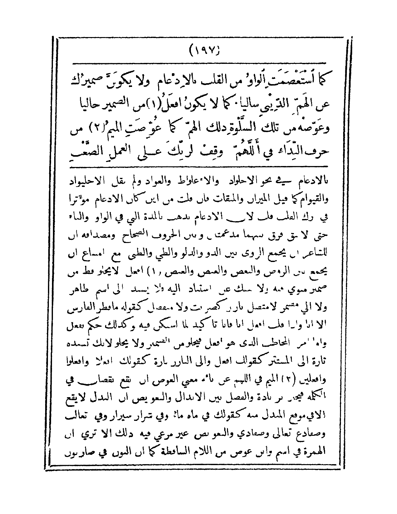 كما استعْصَمتِ الوَاوُ منَ القَلْبِ بالإدْغامْ، ولا يَكُونَنَّ ضَميرُكُ عَنِ الهَمِّ الدِّيْنيِّ سَالياً، كمَا لا يَكُون أفْعَلُ منَ الضّمير خالِياً. وعَوِّضْهُ مِنْ تلكَ السلوَةِ ذلكَ الهَمْ، كمَا عُوِّضَتِ الميمُ مِنْ حَرْفِ النِّدَاءِ في اللهُمْ. وَقِفْ لِرَبِّكَ على العَمَلِ الصَّعْبِ